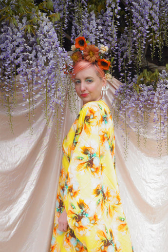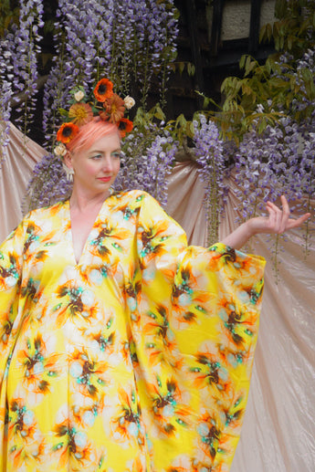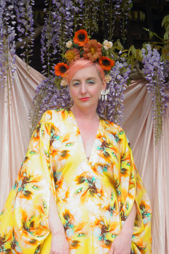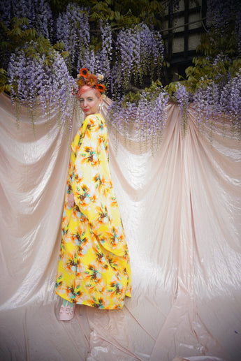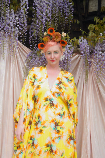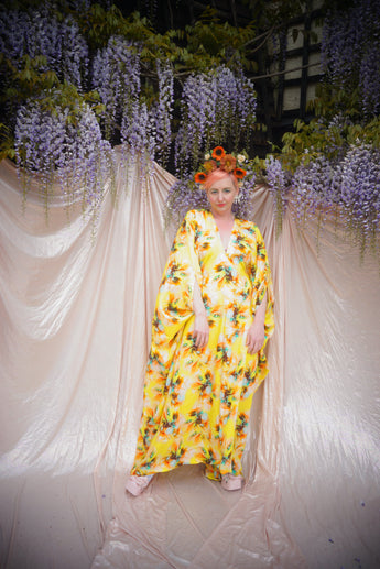 Our kaftan dresses are uniquely fitted with hidden velvet ribbons on the inside meaning you can wear them two ways - 1) Free, loose and baggy, and 2) with the ribbons tied at the waist to pull the dress in and frame your figure.