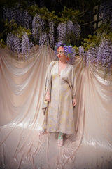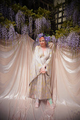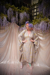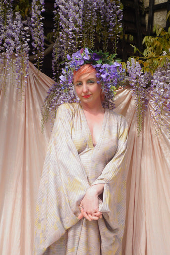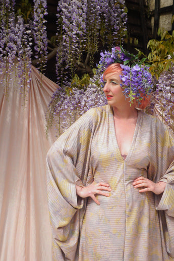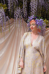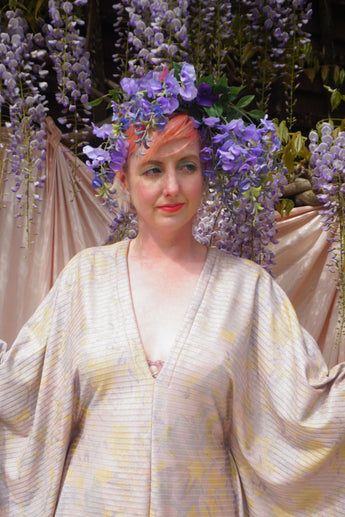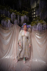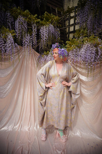 Our kaftan dresses are uniquely fitted with hidden velvet ribbons on the inside meaning you can wear them two ways - 1) Free, loose and baggy, and 2) with the ribbons tied at the waist to pull the dress in and frame your figure.