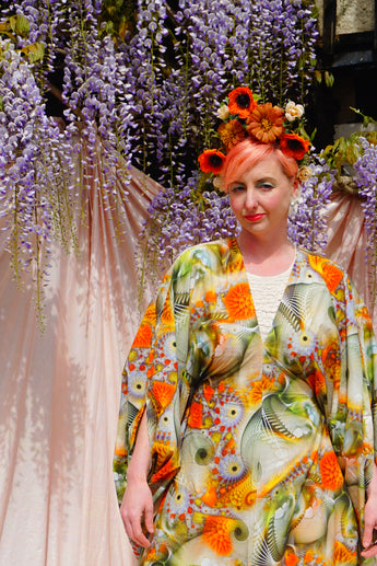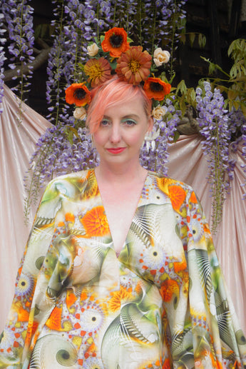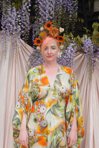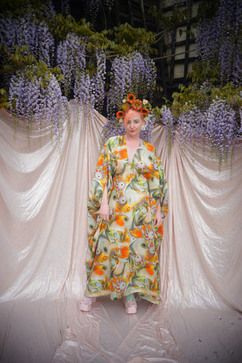 Our kaftan dresses are uniquely fitted with hidden velvet ribbons on the inside meaning you can wear them two ways - 1) Free, loose and baggy, and 2) with the ribbons tied at the waist to pull the dress in and frame your figure.