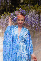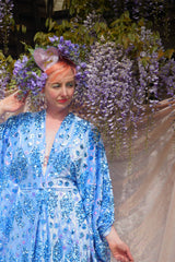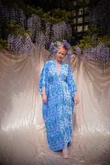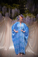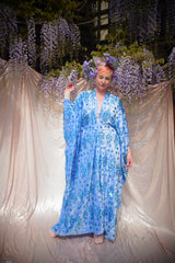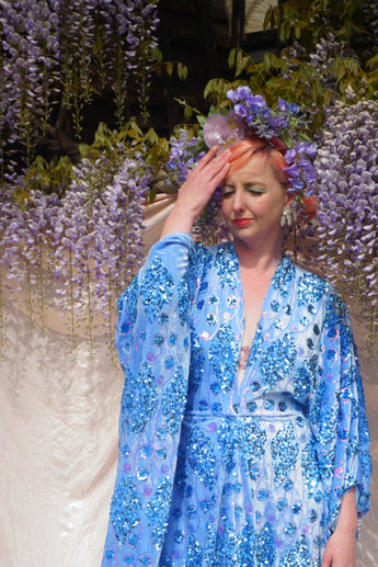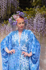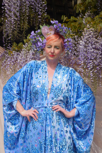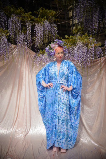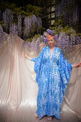 Velvet Blue and Pink patterned sequin Kaftan - Ruched centre batwing style