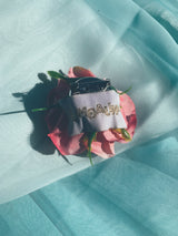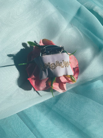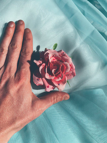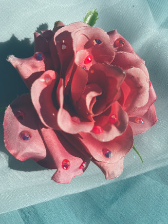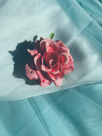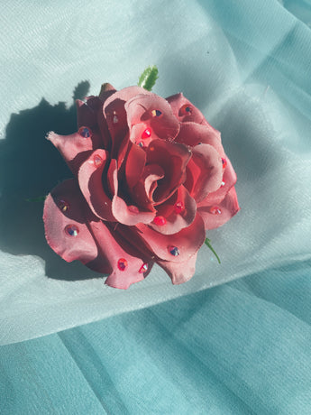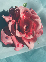 Delicate candy pink Tea Rose with central Jewel and embellished with rhinestones on a silver Brooch Back.