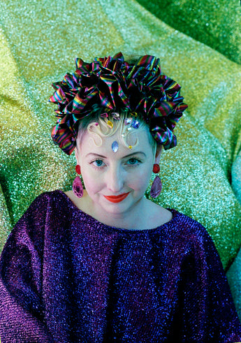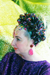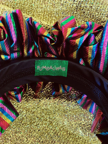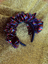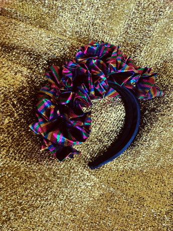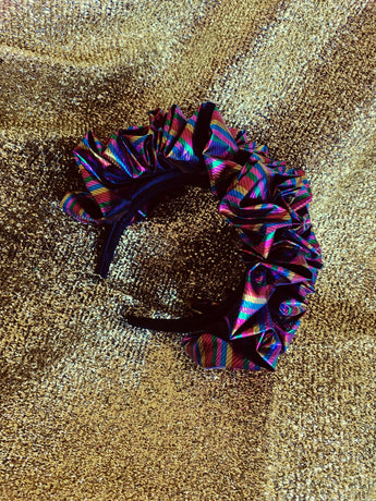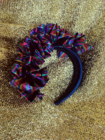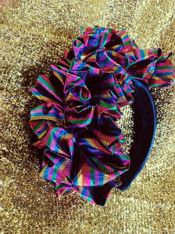 2) As yet UNRELEASED Rainbow striped Ruffle headband in pink, gold, blue,  green and red in a stiffened lame foil fabric. Winner can choose a full or asymmetric style