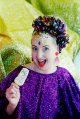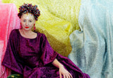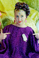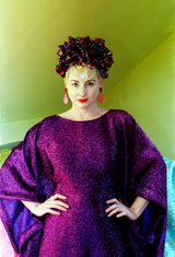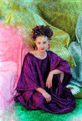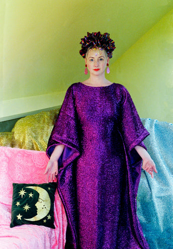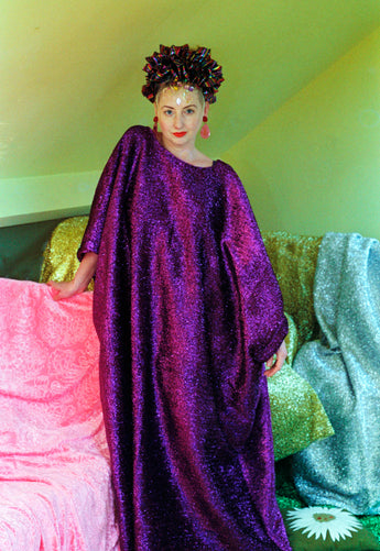 1) Purple Tinsel knit metallic kaftan Dress! Our signature dress in a one of a kind Purple colour!  This is THE only dress in this fabric i can offer as it is proving impossible to source ANYWHERE! They are a free size (with full measurements below) and have hidden velvet ribbons on the inside meaning you can wear them two ways - 1) Free, loose and baggy, and 2) with the ribbons tied at the waist to pull the dress in and frame your figure.  (You can swap for one of our other colours if you prefer - green, silver or gold)