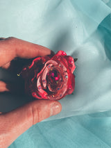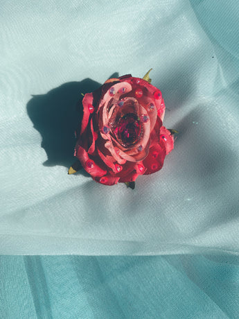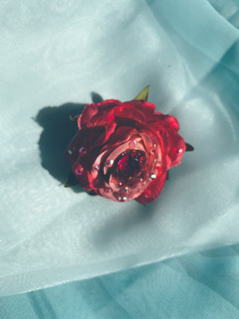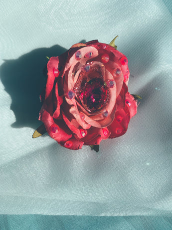 Delicate Hot Pink Rose with central Jewel and embellished with rhinestones on a silver Brooch Back and a glittered finish.