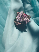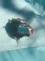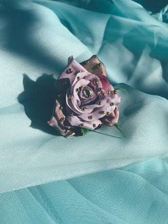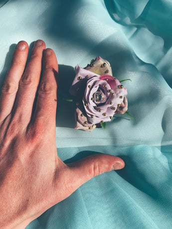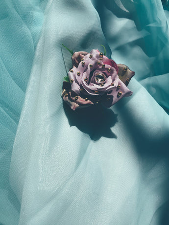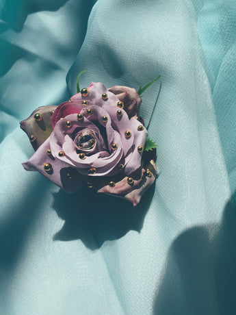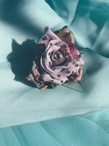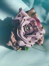 Delicate Lilac Tea Rose with central Jewel and embellished with GOLD rhinestones on a silver Brooch Back.