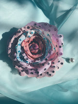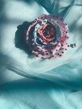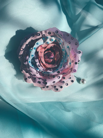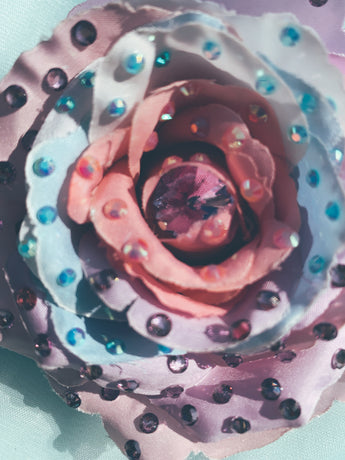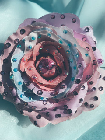 Pastel mix rose, heavily hand jewelled and fitted with a brooch and pin finish.