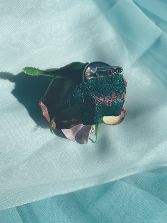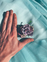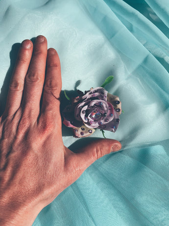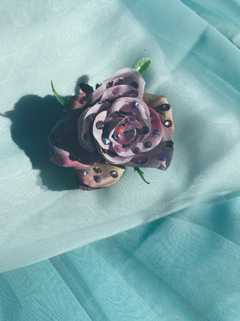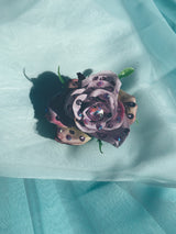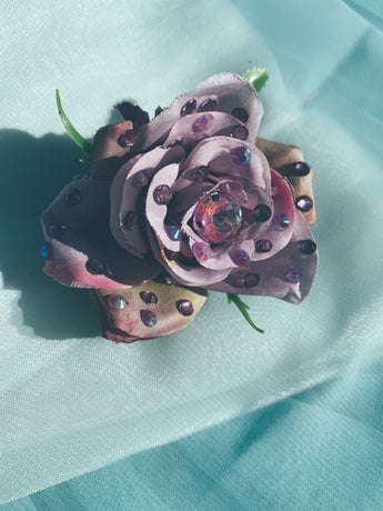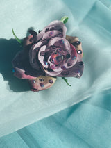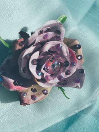 Delicate Lilac Tea Rose with central Jewel and embellished with rhinestones on a silver Brooch Back.