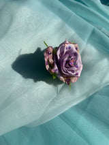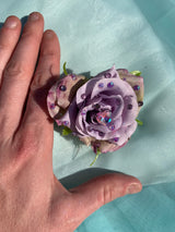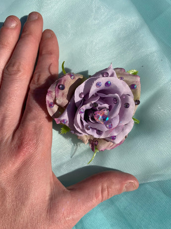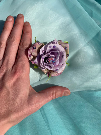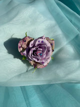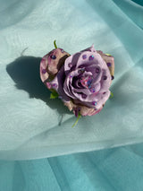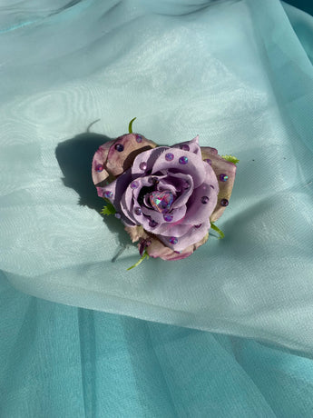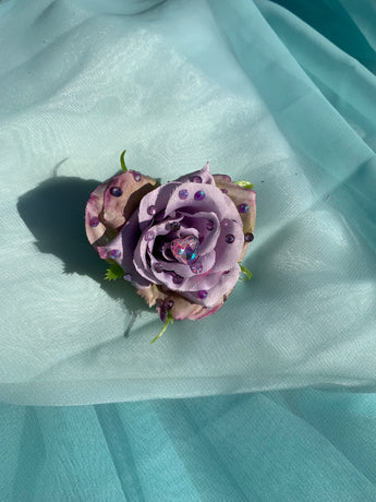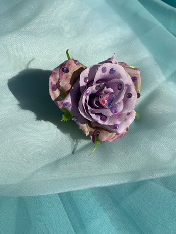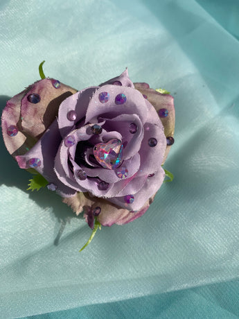Delicate Lilac Rose with heart shaped central Jewel and embellished with rhinestones on a silver Brooch Back.