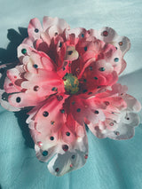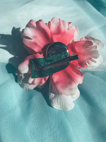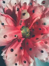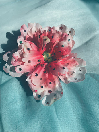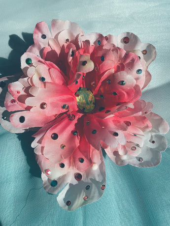 Beautiful pink Peony bejewelled brooch AND hair clip. The central jewel is iridescent green and the rhinestones are mixed colours. One of a kind Piece.