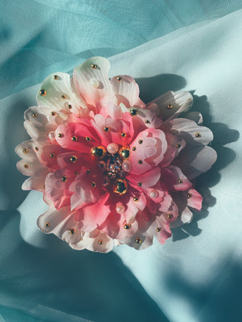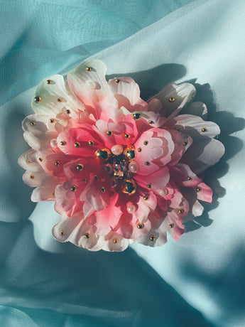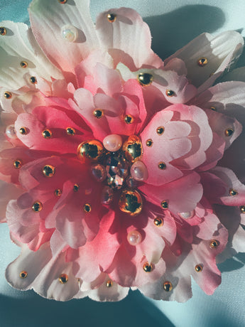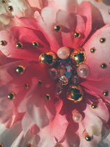 Pretty pink peony adorned with jewel, gold and pearls. Can be work as a brooch or a hair clip
