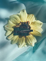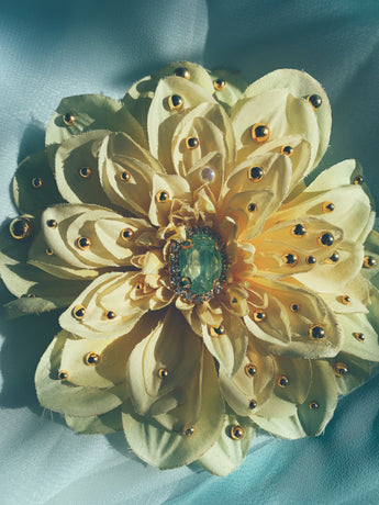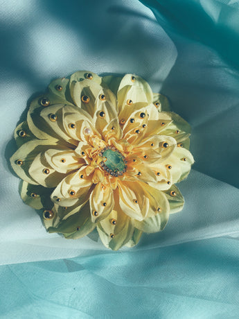 Beautiful yellow chrysanthemum embellished with gold gems and a green iridescent central gem. Can be work as a brooch or a hair clip