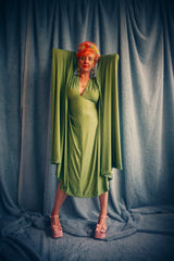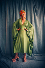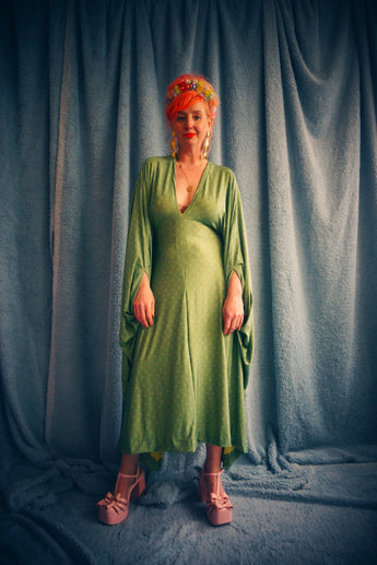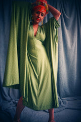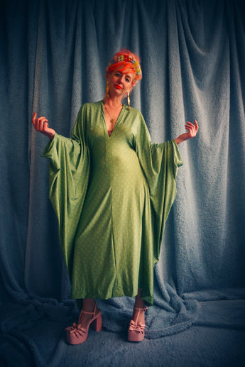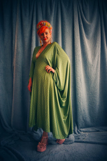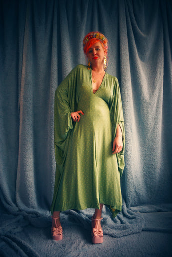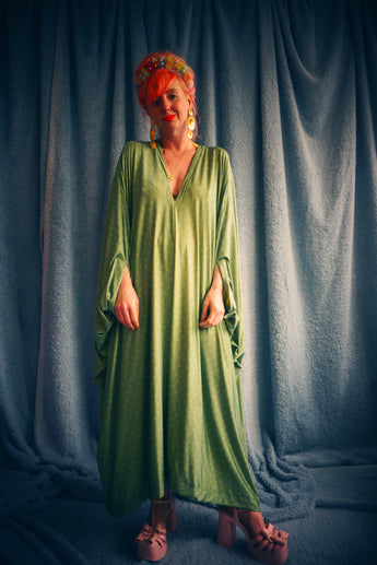 Disco shimmer green semi circles geometric print Kaftan Gown. Plenty of stretch in a slinky lycra fabric