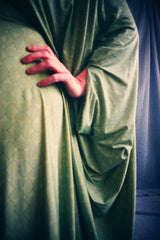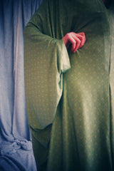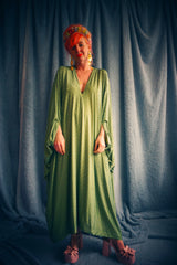 Our kaftan dresses are uniquely fitted with hidden velvet ribbons on the inside meaning you can wear them two ways - 1) Free, loose and baggy, and 2) with the ribbons tied at the waist to pull the dress in and frame your figure.
