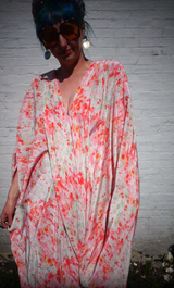 Pleated Pink Watercolour Print V-Neck Kaftan Gown. Slinky lightweight fabric. Worn with our hidden ribbons tied to cinch in at the waist (can also be worn loose).