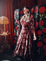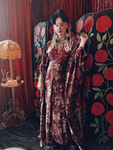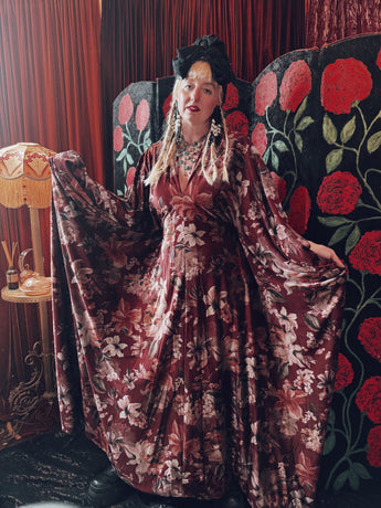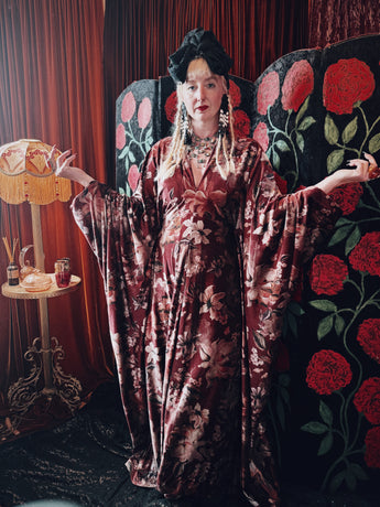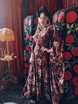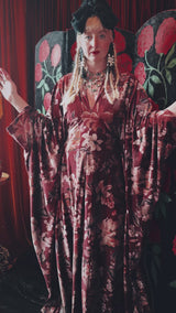 Sacred Rose opulent velvet v-neck kaftan gown. This kaftan is crafted from luxurious velvet with a rich wine-red base and soft, painterly floral design in tonal shades.