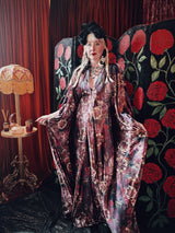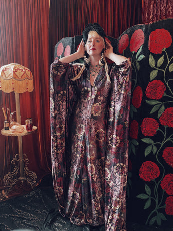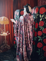 Twilight Bloom opulent velvet v-neck kaftan gown. This kaftan is crafted from plush velvet with an ornate floral jacquard pattern in jewel-like tones of plum, mauve, and antique gold.