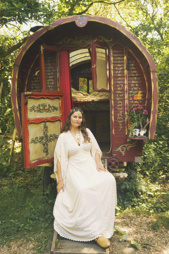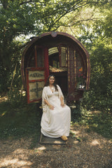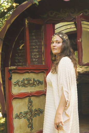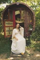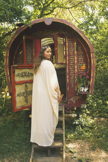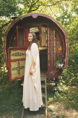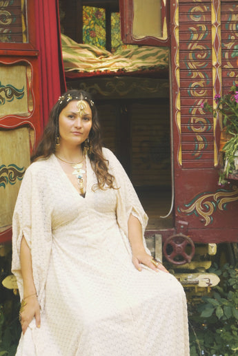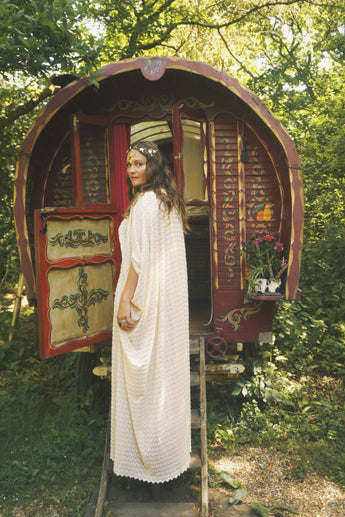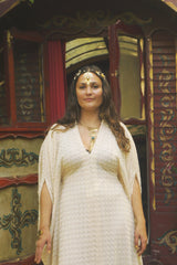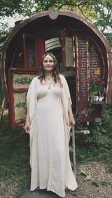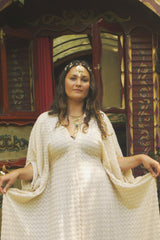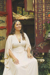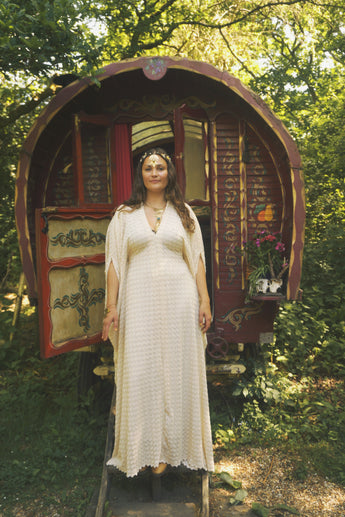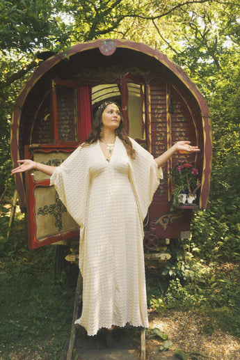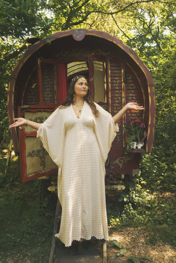 Seraphina textured creamy pale beige coloured Lace V-Neck Kaftan Gown, finished with a scalloped edge. Sheer, lightweight lace, Worn here with a vintage slip underneath.