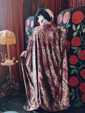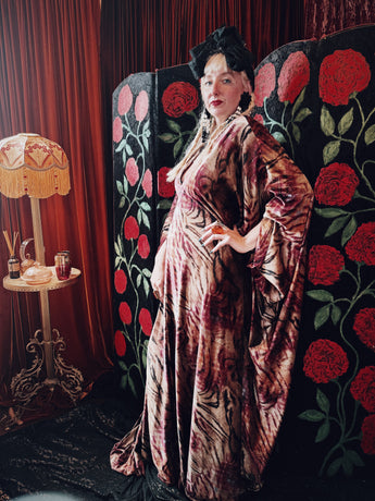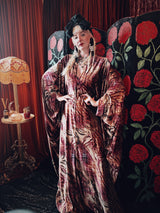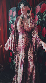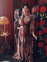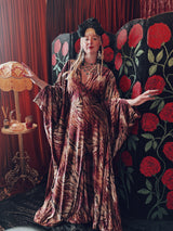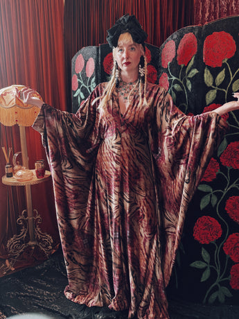 Wild wolf opulent velvet v-neck kaftan gown. This kaftan is crafted from a sumptuously soft velvet with a rich, marbled animal-inspired pattern in deep burgundy, plum, and earthy golden tones.