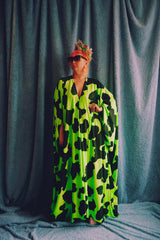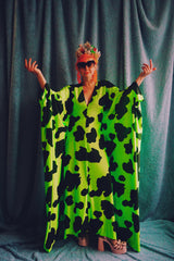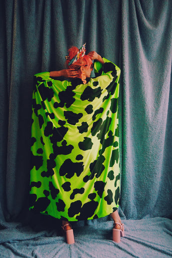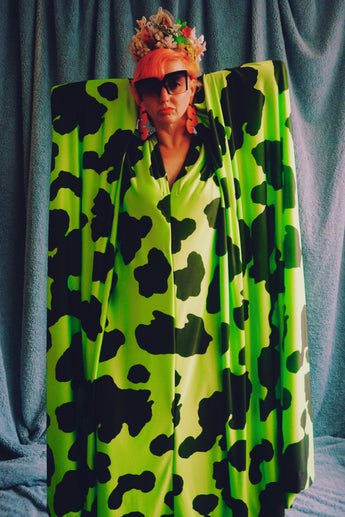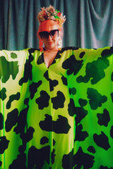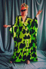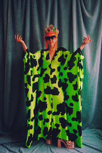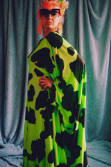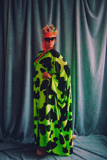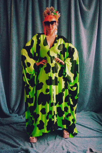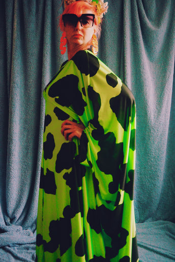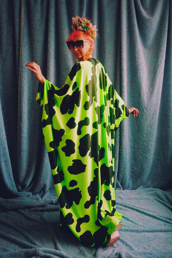 Out of this world neon cow print kaftan gown in a stretchy slinky spandex fabric.