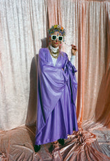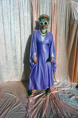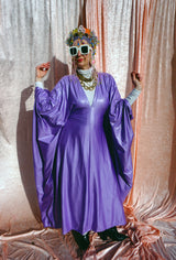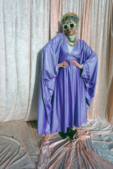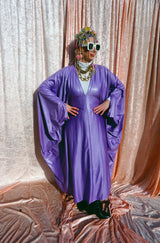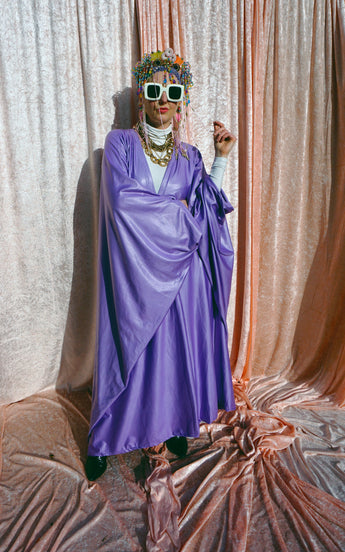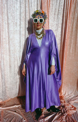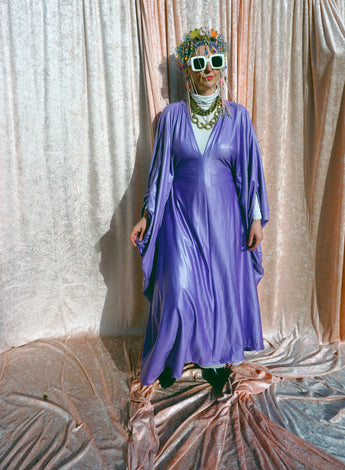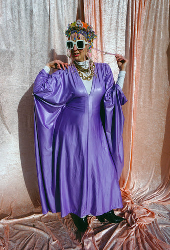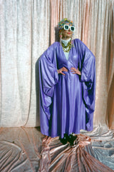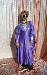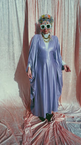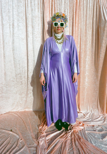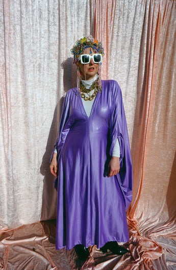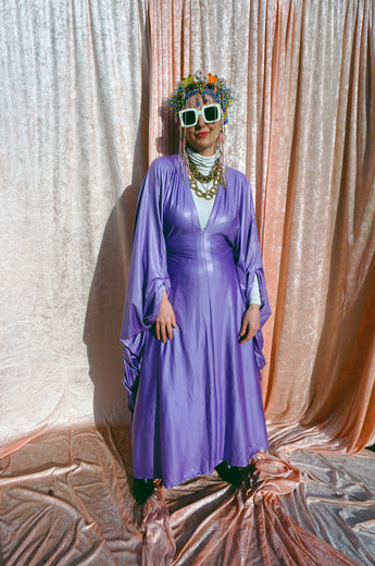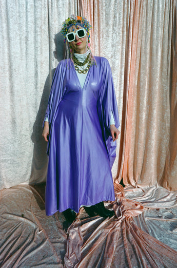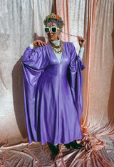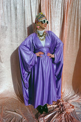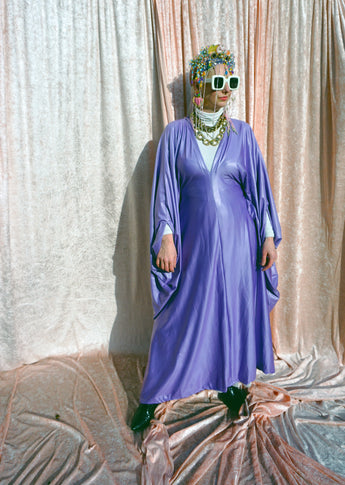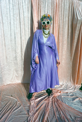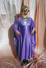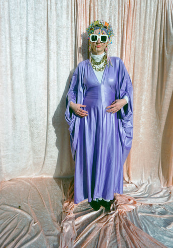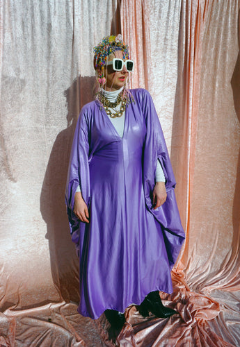 stretchy wet look PVC lilac Kaftan Gown. Please check the measurements for the ready to ship piece as it comes up shorter than our usual lengths. Alterations such as altering the length can be made for free - please add your desired length when the garment is laid flat to your order notes.