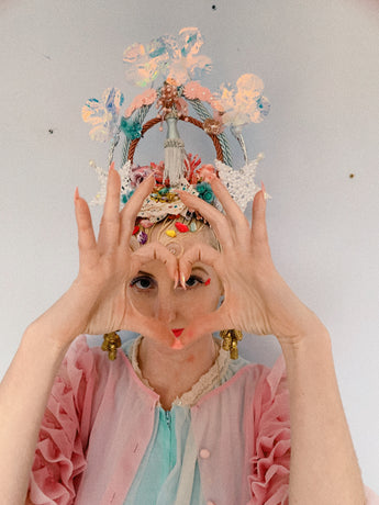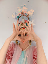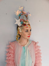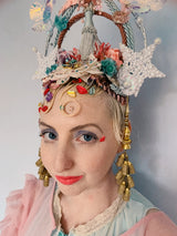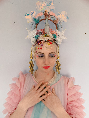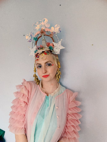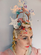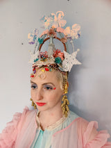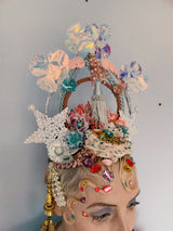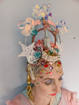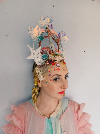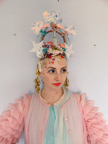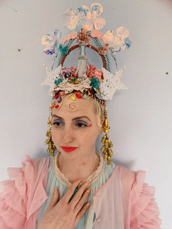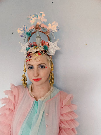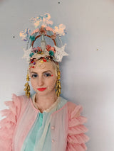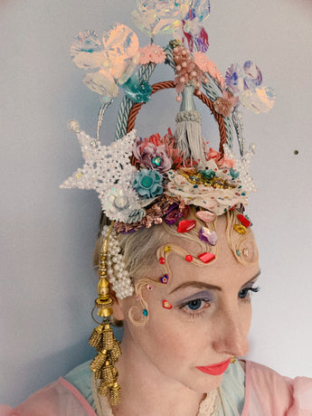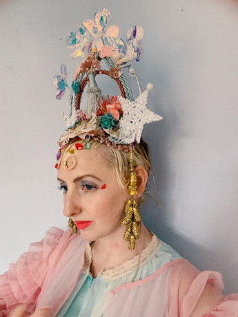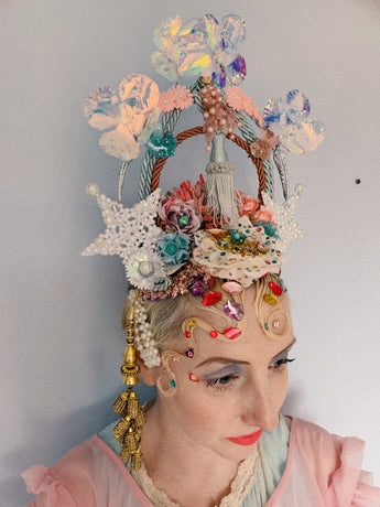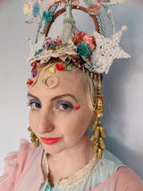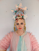 One of a kind halo crown consisting of an arch of vintage cord, iridescent wired flowers, iridescent gemmed stars, and an array of vintage earrings and bejewelled flowers. Finished with gold dangly tassels.