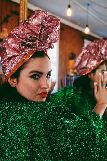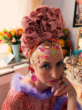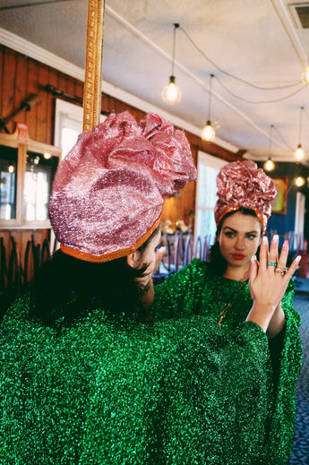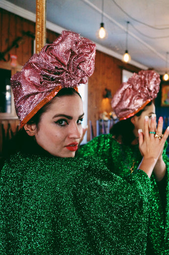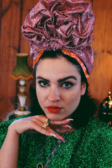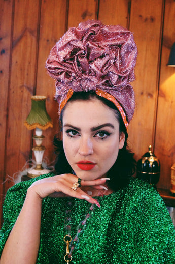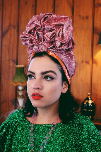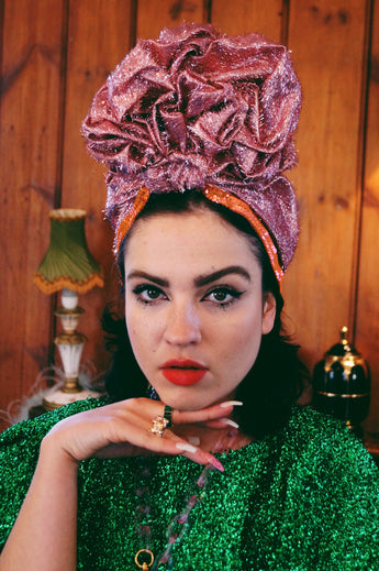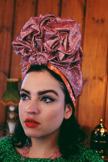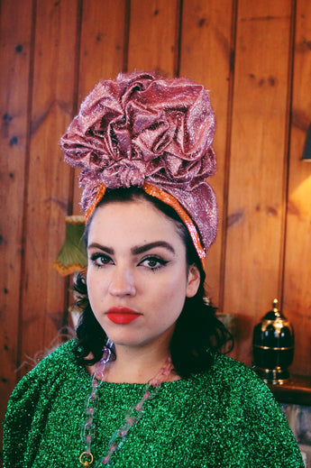 Gorgeous pale pink handmade tinsel turban. Lined with a metallic fabric. Comes in one size so may need extra grips for support (no stretch to the fabric). Photos show the turban with a sequin trim but sadly it is no longer available so will come with a matching pale pink sequin trim.