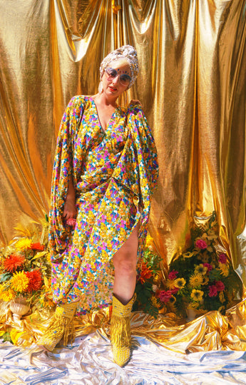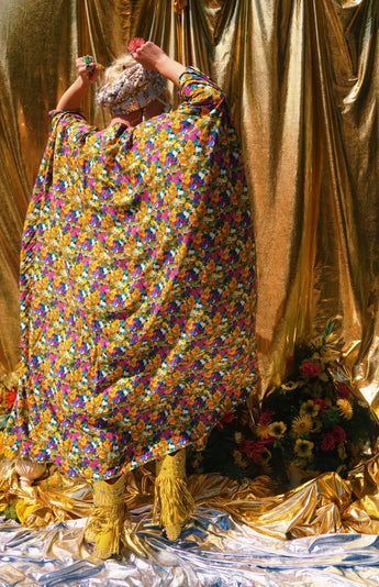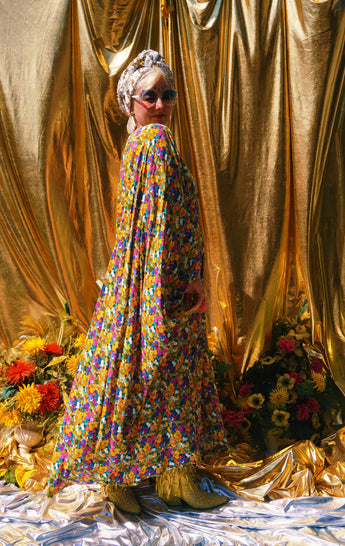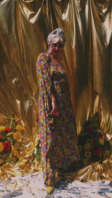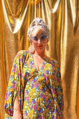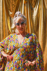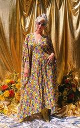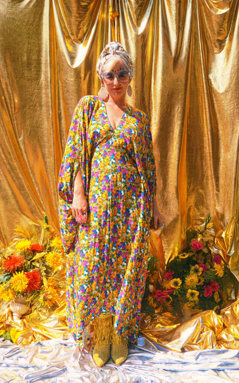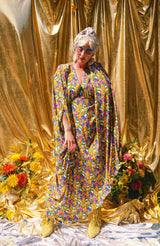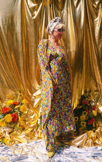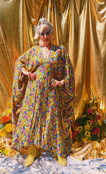 Pansy Meadow Slinky V-Neck Kaftan Gown. The fabric features an all-over pansy print in a riot of colour.