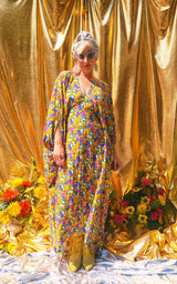 Pansy Meadow Print V Neck Kaftan Gown, Freesize
