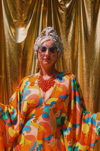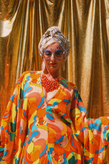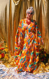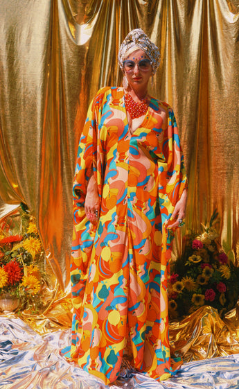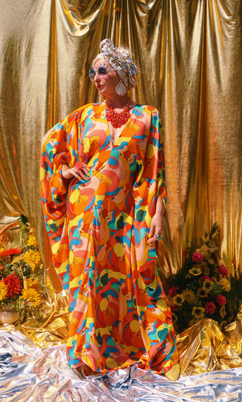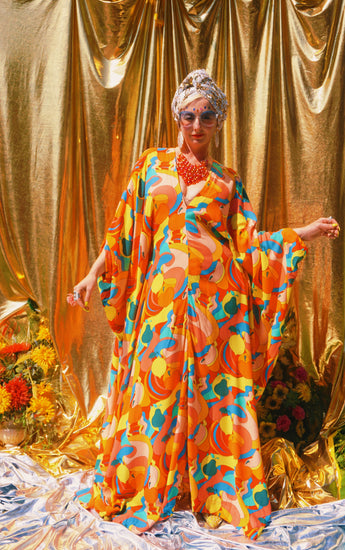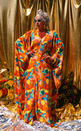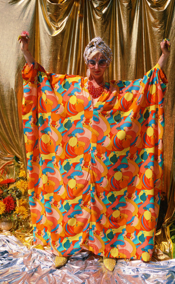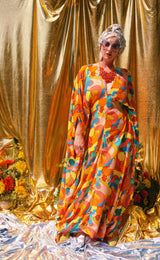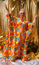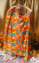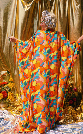 Fruit Punch viscose V-Neck Kaftan Gown. The fabric features an abstract swirl of vibrant oranges, peaches, lemons, and pears.