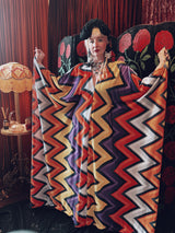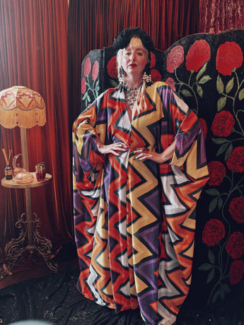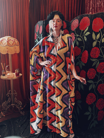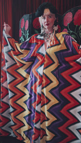 zig zag zone opulent velvet v-neck kaftan gown. The fabric is a bold zig-zag chevron pattern in fiery orange, mustard, deep purple, black, and grey/silver.