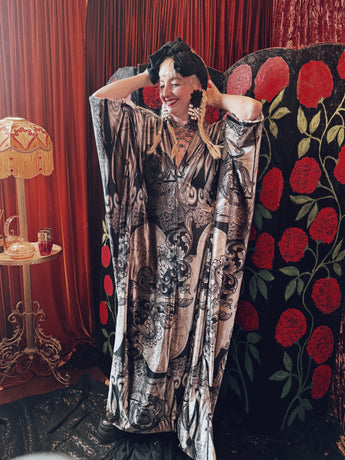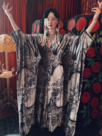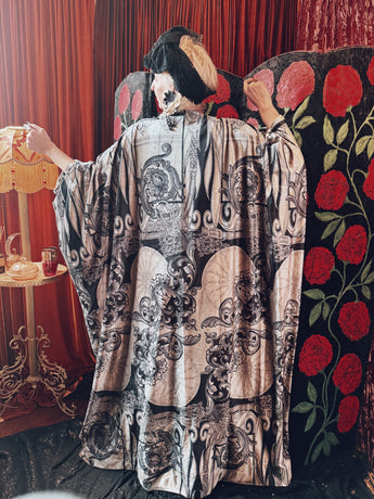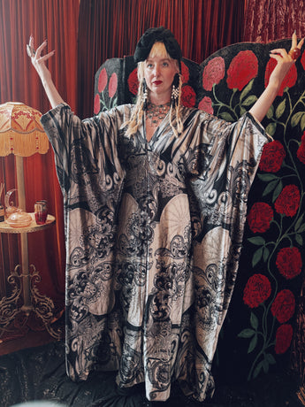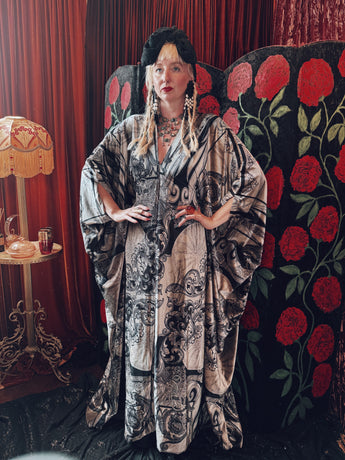 Celestial Baroque opulent velvet v-neck kaftan gown, featuring a monochrome colour palette.
