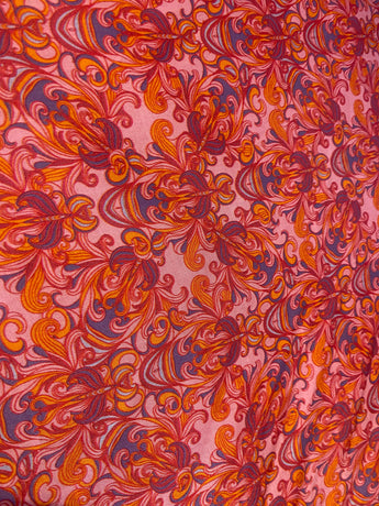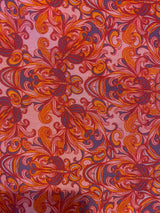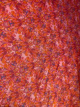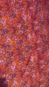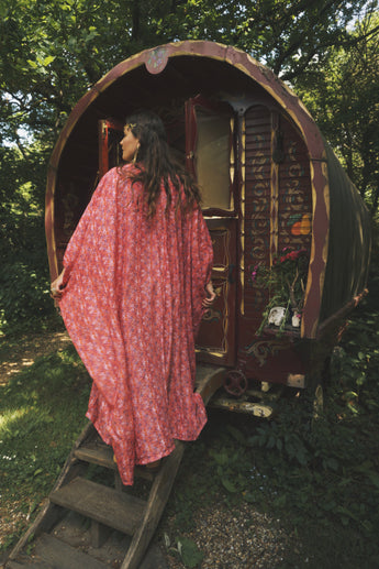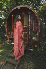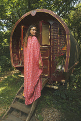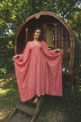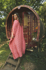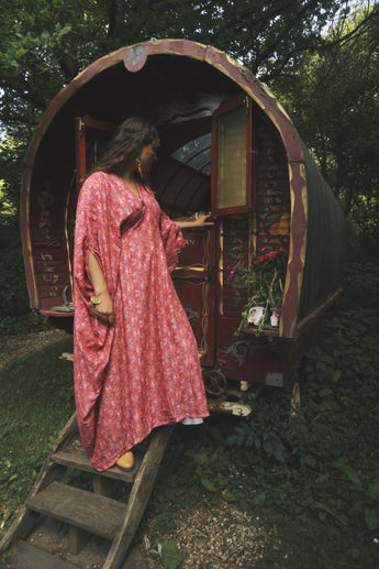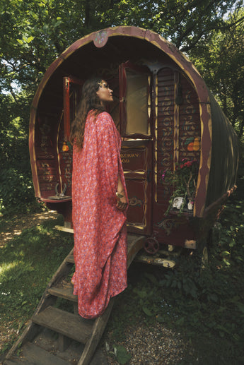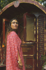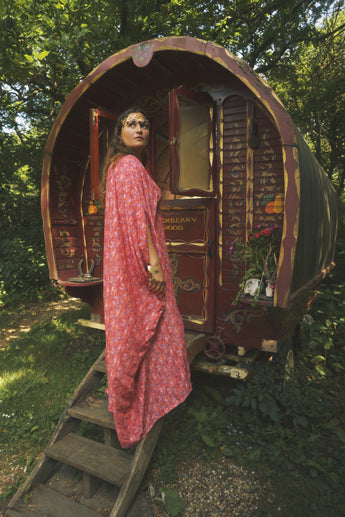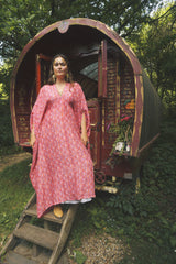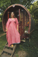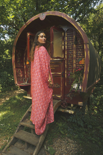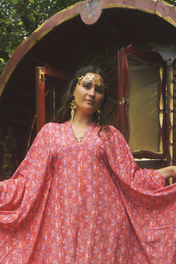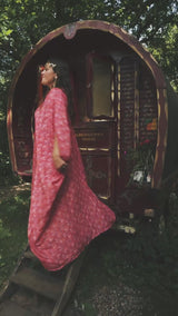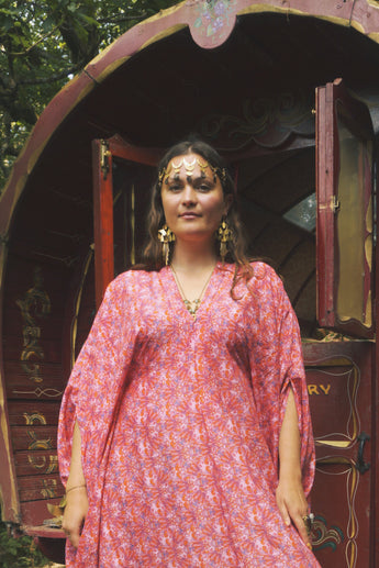 Fireflower V-Neck Kaftan Gown. Vibrant print in shades of pink and purple. Worn with a vintage slip underneath. lightweight breathable viscose fabric.