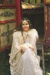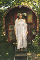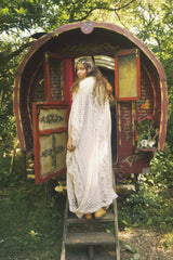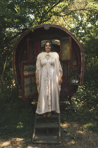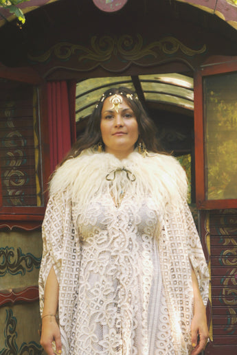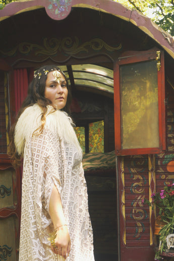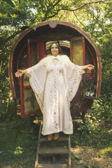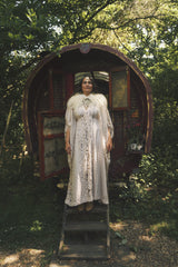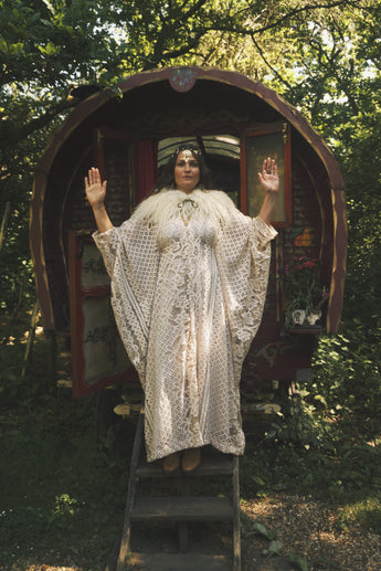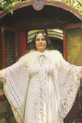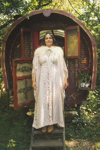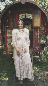 Oracle of the North Lace V-Neck Kaftan Gown. Sheer, lightweight lace, Worn here with a vintage slip underneath.