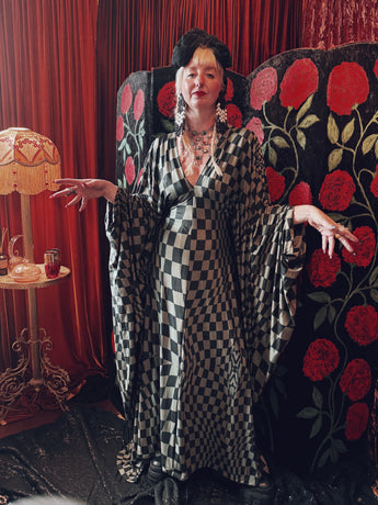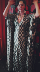 Checkerboard Maze slinky v-neck kaftan Gown plenty of stretch