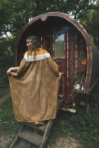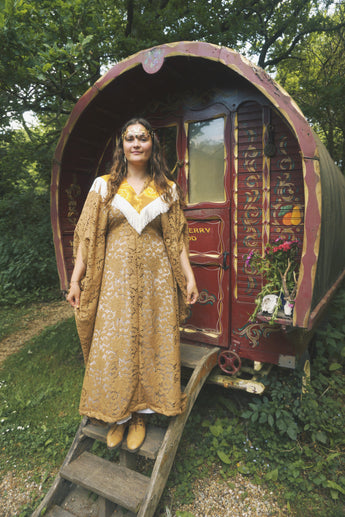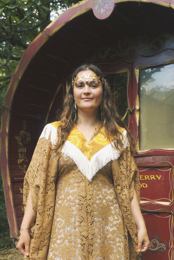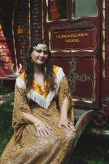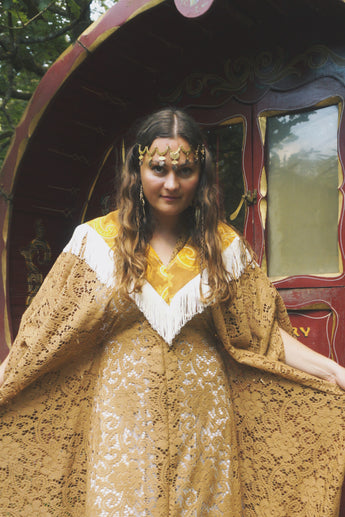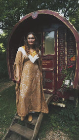 Golden Sage Flocked Lace V-Neck Kaftan Gown. semi sheer - Worn with a vintage slip underneath. *DOES NOT COME WITH COLLAR - Find collar via I'd wear That