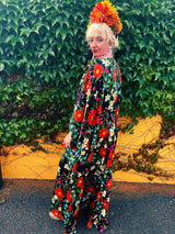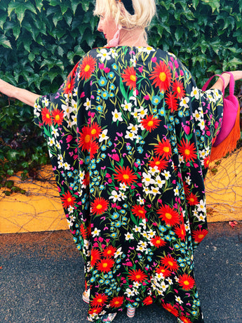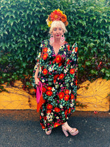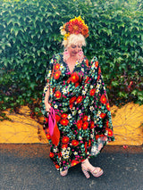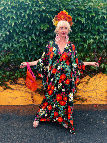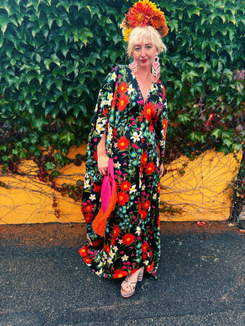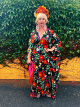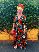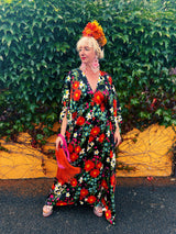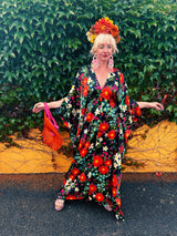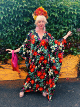 Walk on the Wildside Wildflower satin V-Neck Kaftan Gown - a gorgeous array of wildflowers on a medium weight sikly viscose satin fabric. Doesn't crease and feels lovely to the touch. Matching Headdress available here