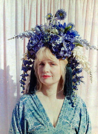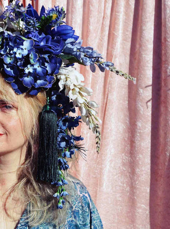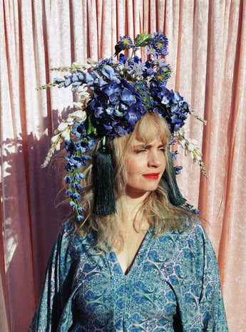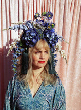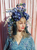Large Blue and Green Floral Headdress with hydrangeas and Tassels
