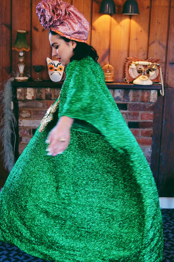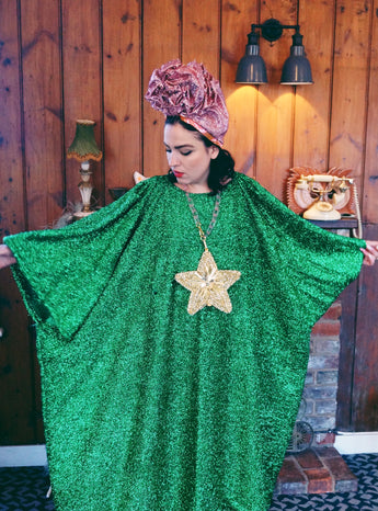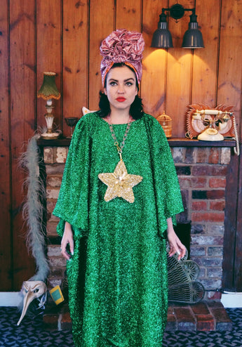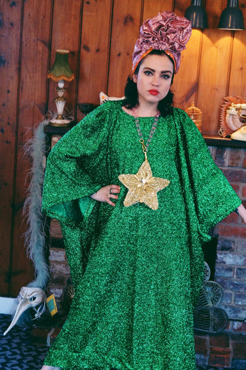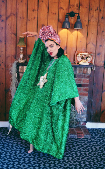 The kaftans are a bespoke design influenced by vintage kaftans dresses dating back to the 70s. They are made from a ludicrously sparkly metallic tinsel woven knit fabric so are precious and fragile and can snag. We have lined the inside of the fabric with a protective and washable sealant to toughen the weave, but we still advise you to wear and handle your kaftan with care - much like any other loved item in your wardrobe! There is no fabric lining to the kaftan so you may want to wear something underneath to stop you from getting nippy!
