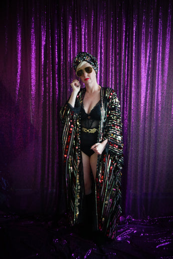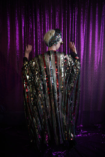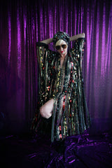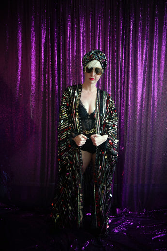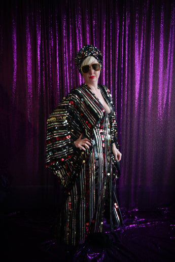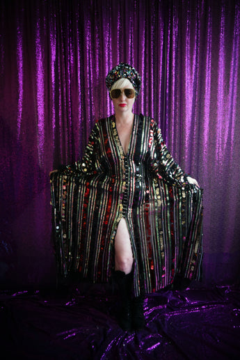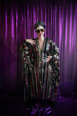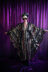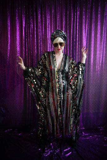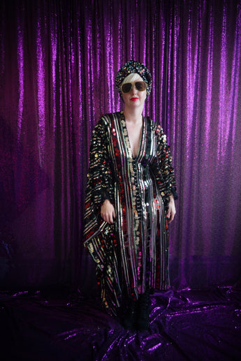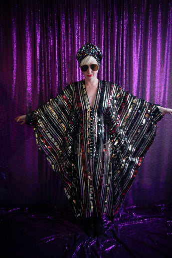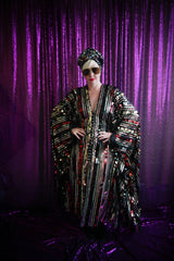 Our kaftan dresses are uniquely fitted with hidden velvet ribbons on the inside meaning you can wear them two ways - 1) Free, loose and baggy, and 2) with the ribbons tied at the waist to pull the dress in and frame your figure.
