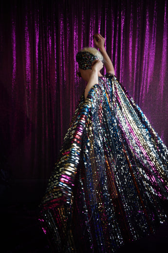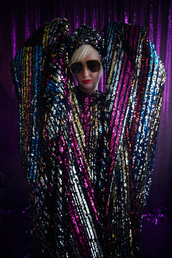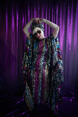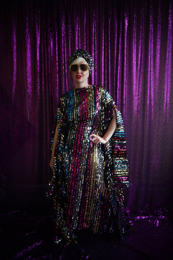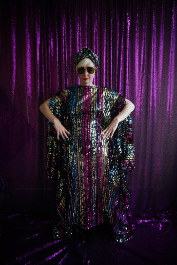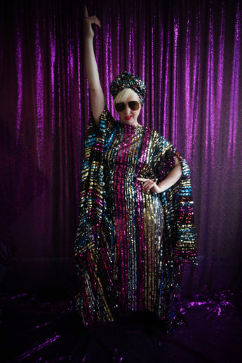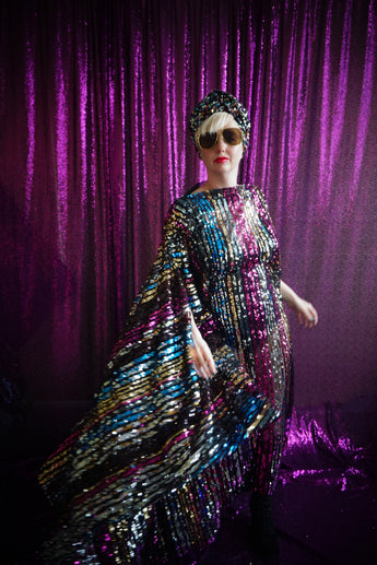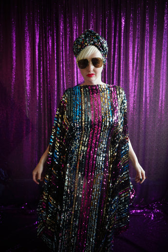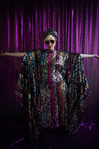 Super Sleeve Multi coloured Rainbow Striped Metallic technicolour dreamcoat Kaftan Gown