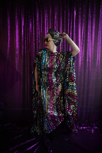 Our kaftan dresses are uniquely fitted with hidden velvet ribbons on the inside meaning you can wear them two ways - 1) Free, loose and baggy, and 2) with the ribbons tied at the waist to pull the dress in and frame your figure.