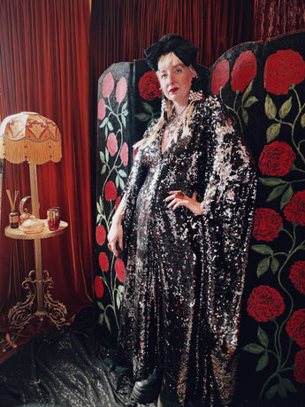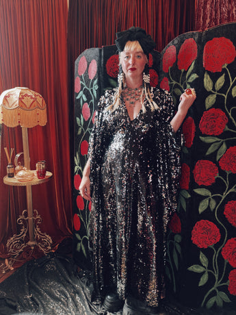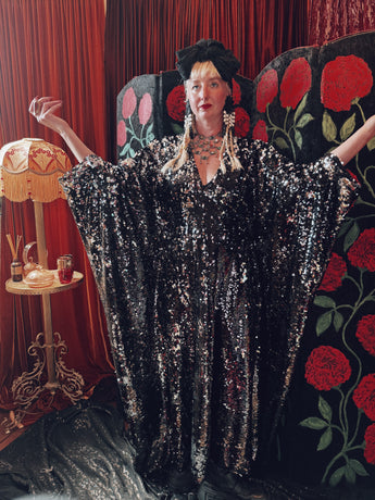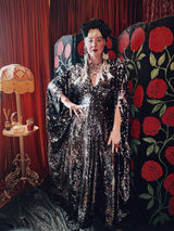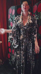 Silver Midnight sequin v-neck kaftan gown. Crafted from a black sequin base shot through with silver shimmering sequins.