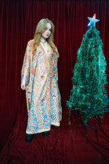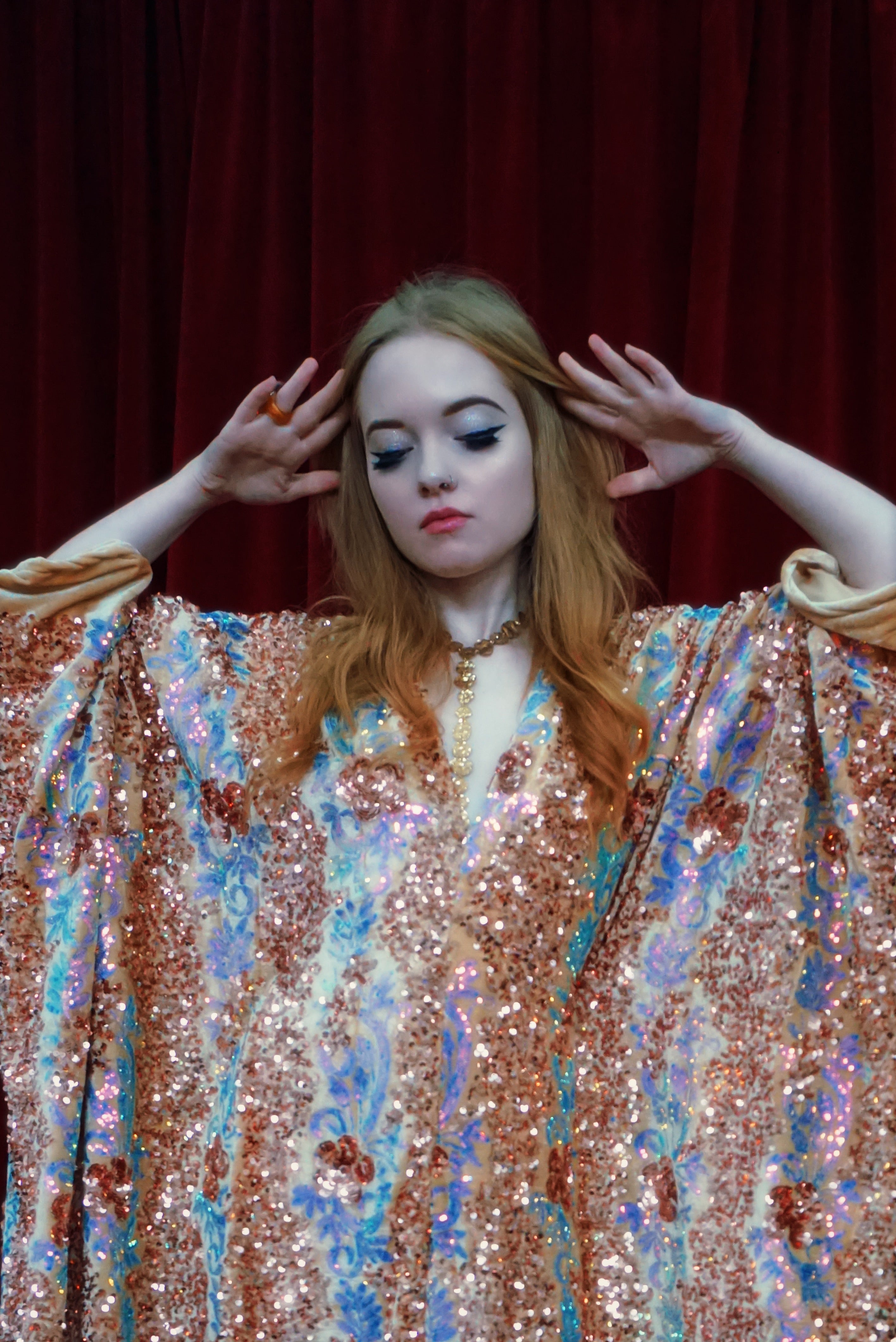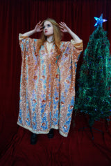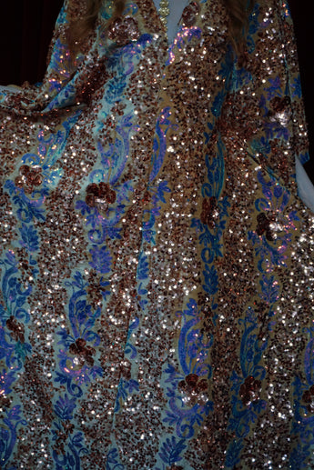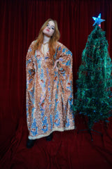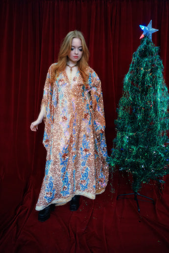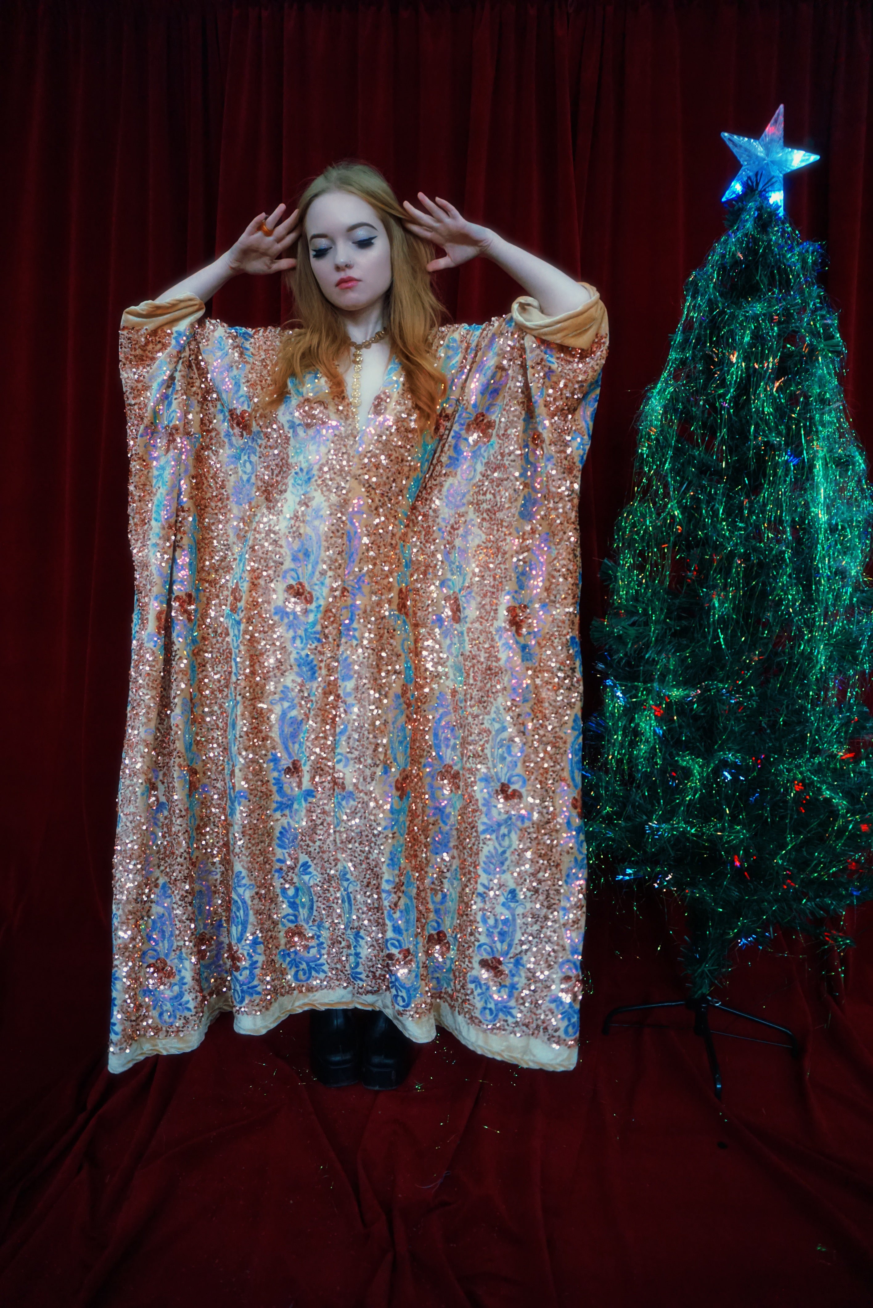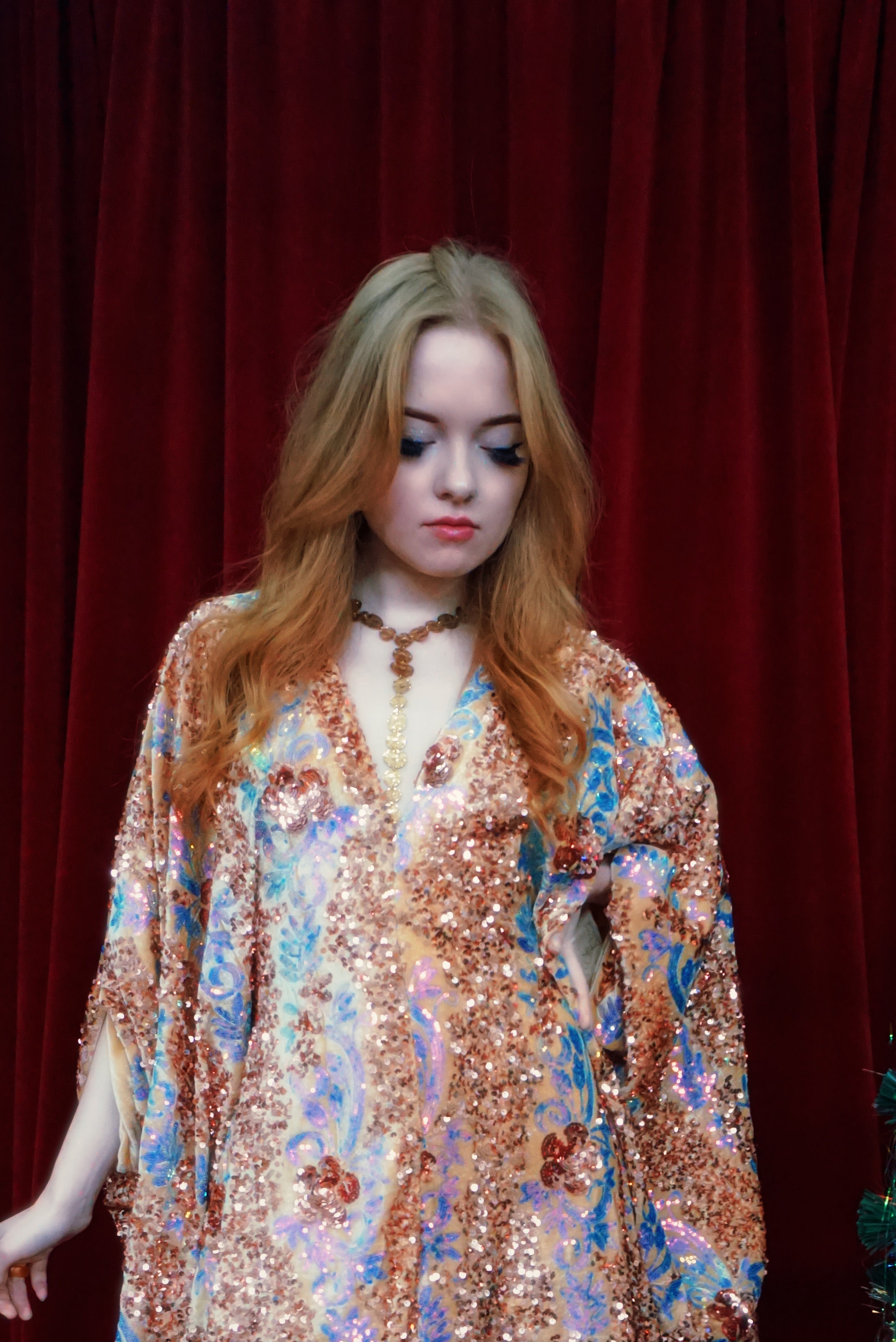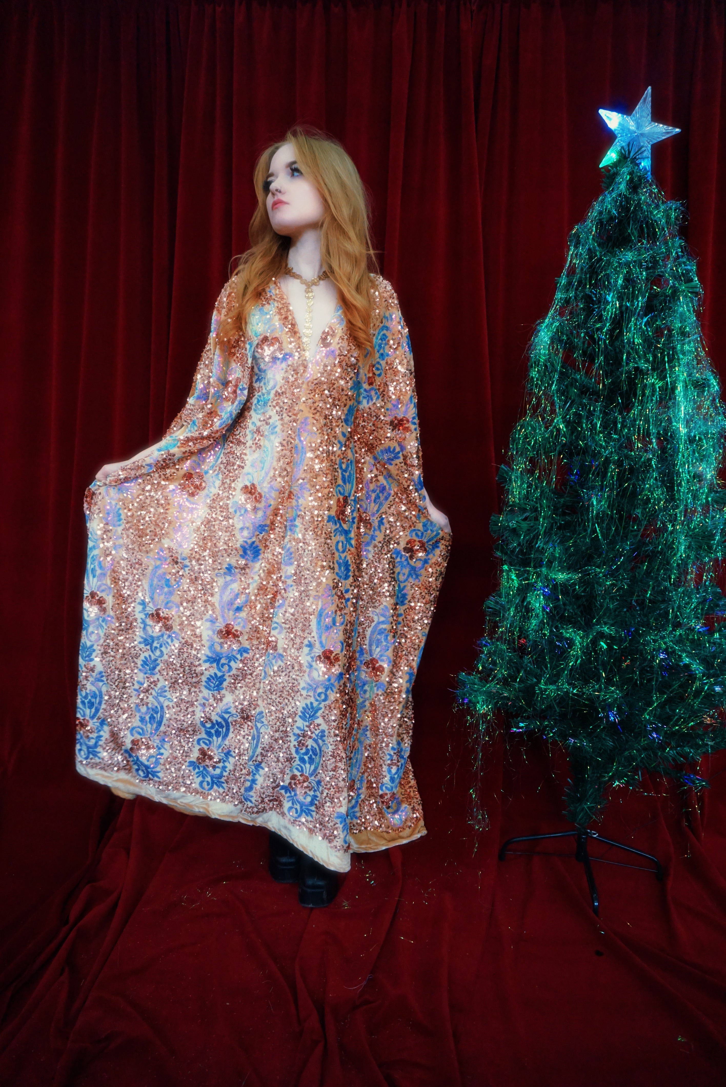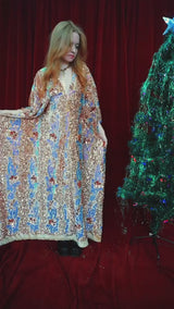 Glittering Florentine Sequin V-Neck Kaftan Gown on a pale gold base with iridescent and gold sequins on a plush velvet. An exquisite blend of vintage tapestry, elegance and full-on sequin glamour.