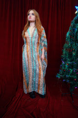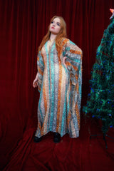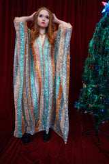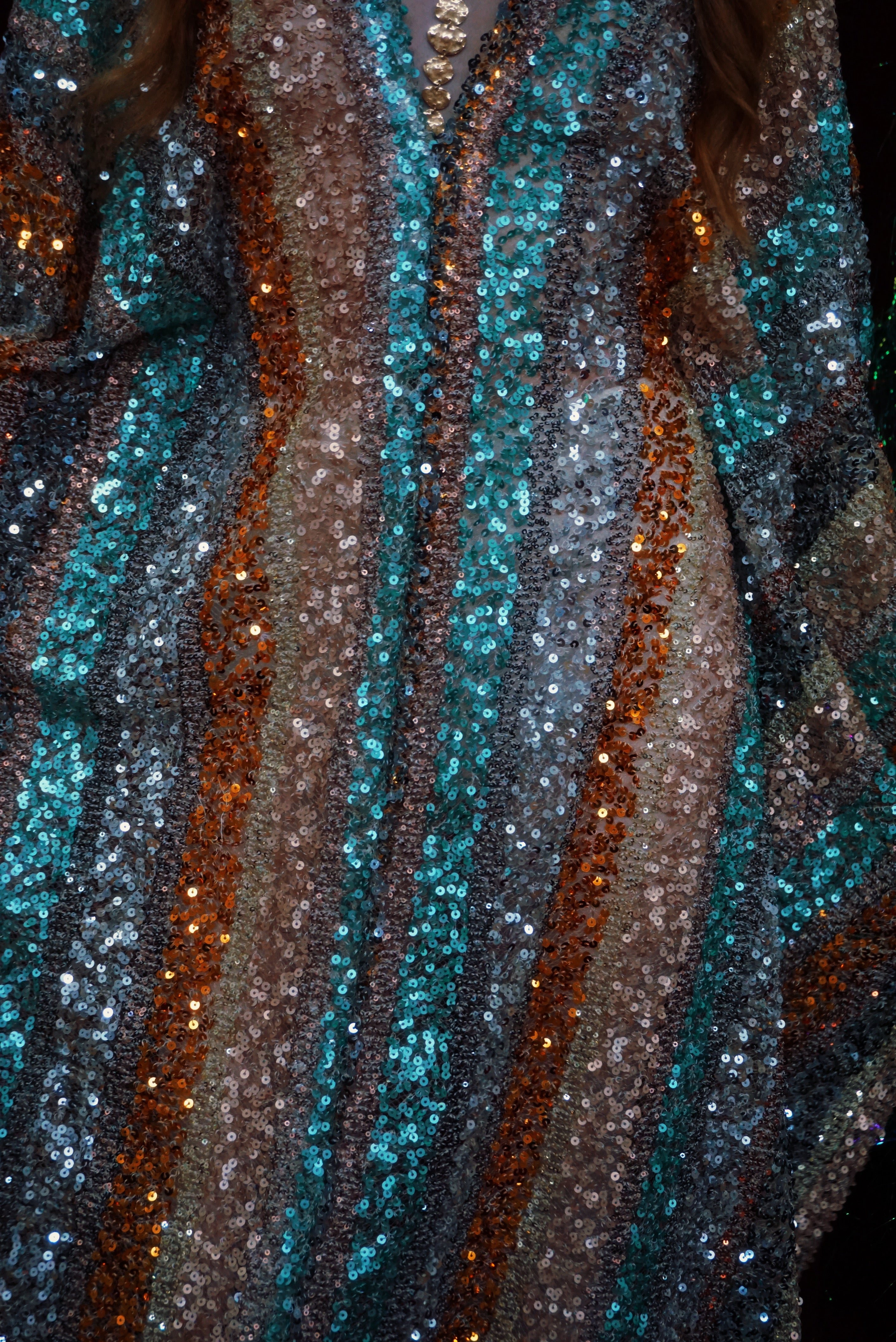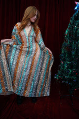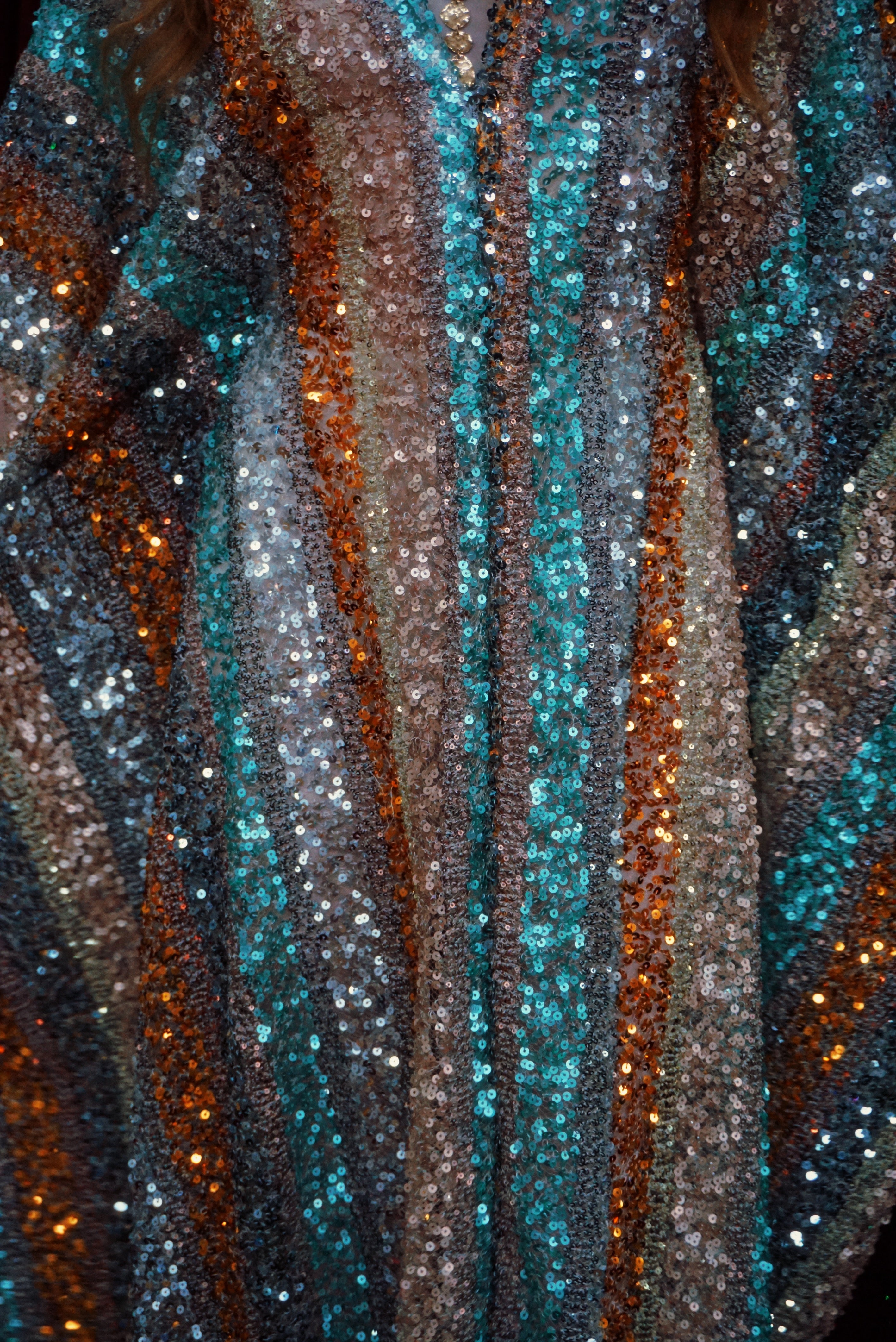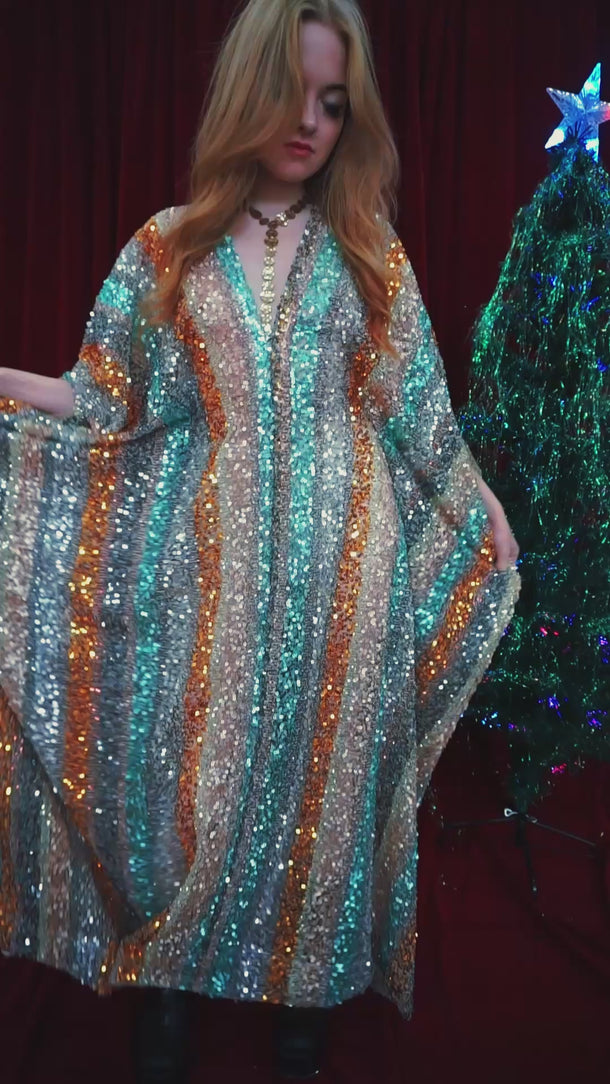 Golden Goblet Sequin V-Neck Kaftan Gown. Crafted from multicoloured sequin stripe fabric in shades of turquoise, bronze, champagne and silver sequins.