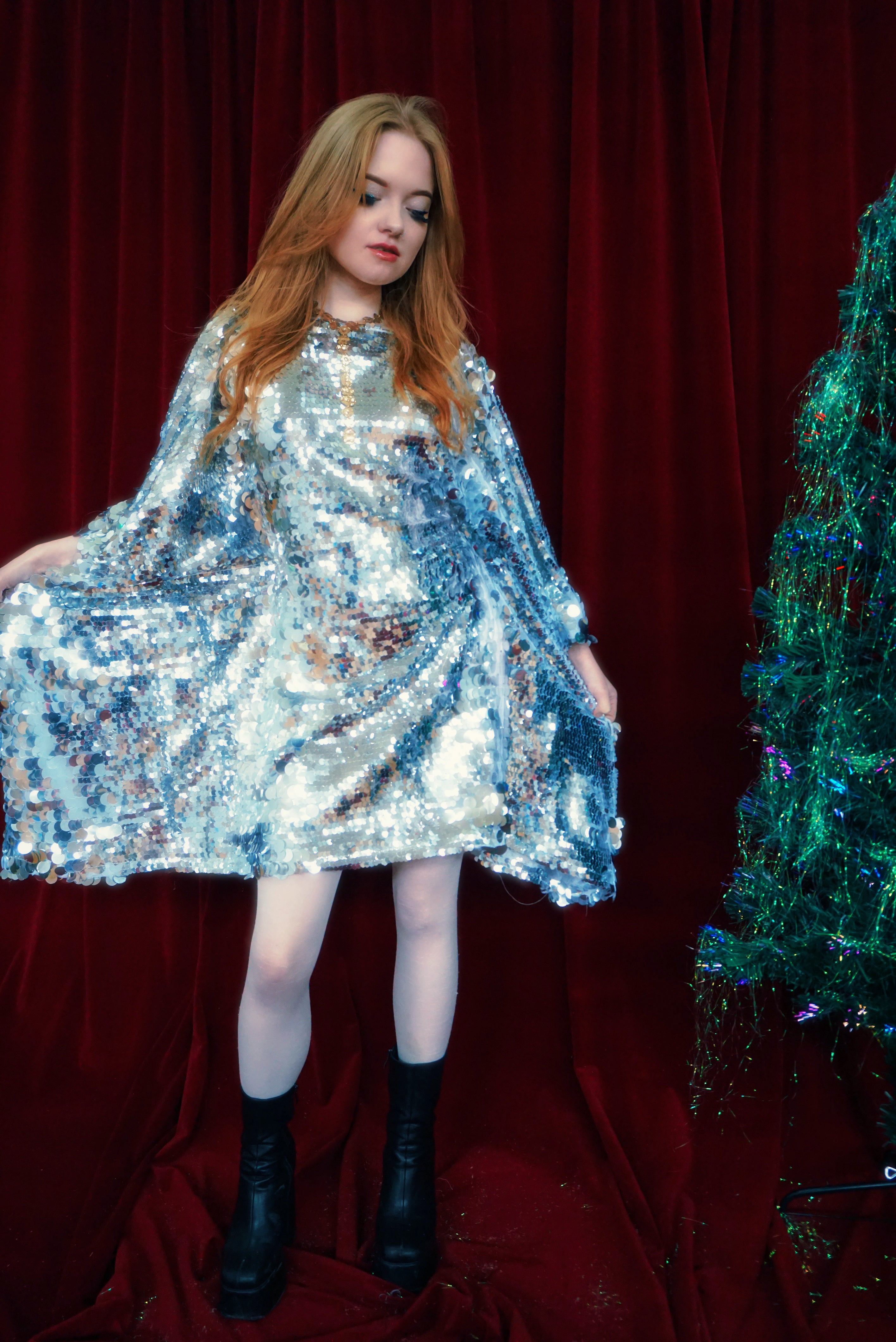 Silver Siren Sequin Kaftan Mini. Crafted from a mix of small and oversized dangly silver sequins, giving pure disco magic.