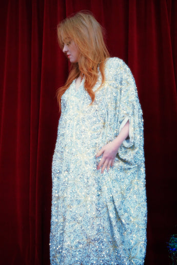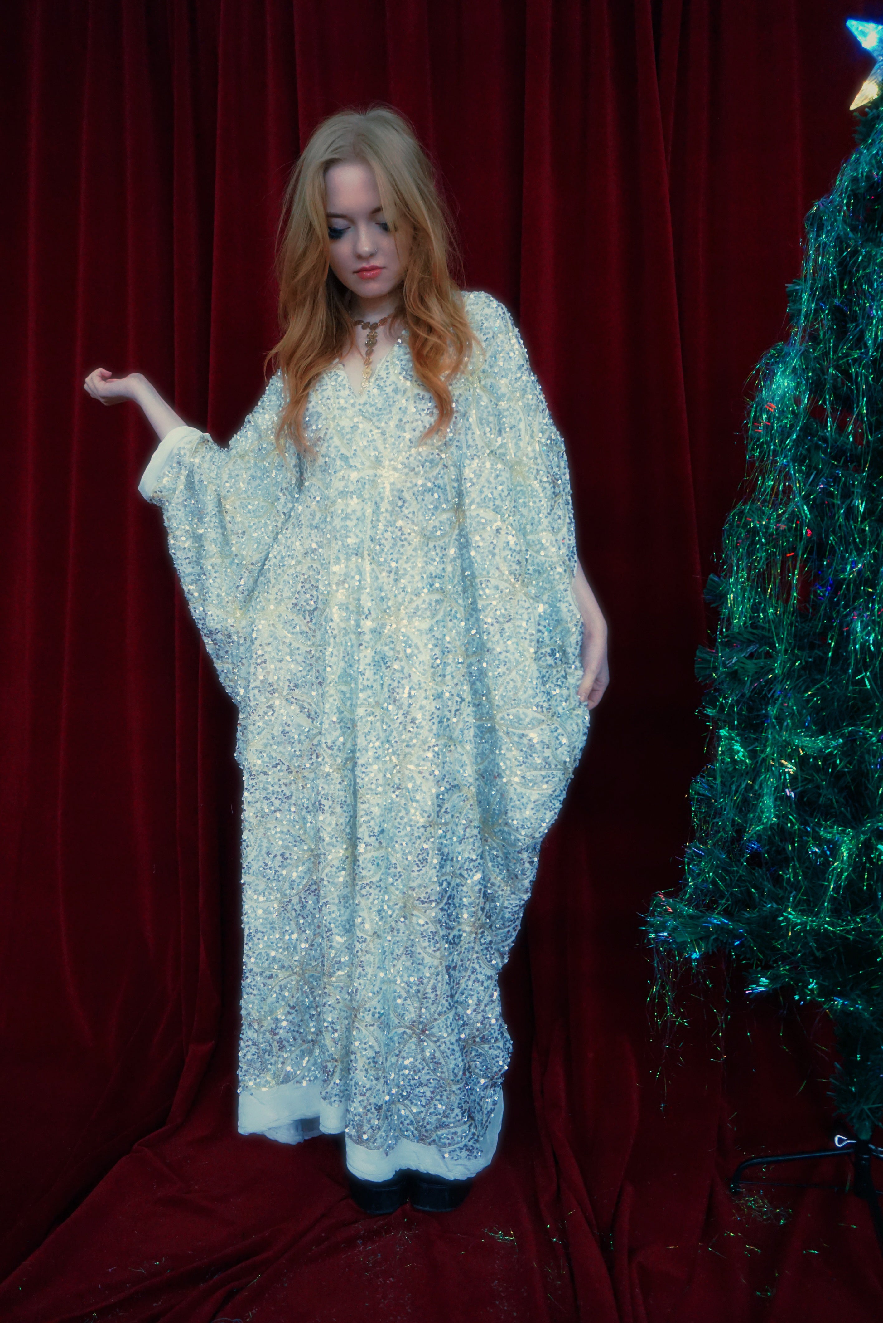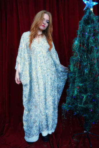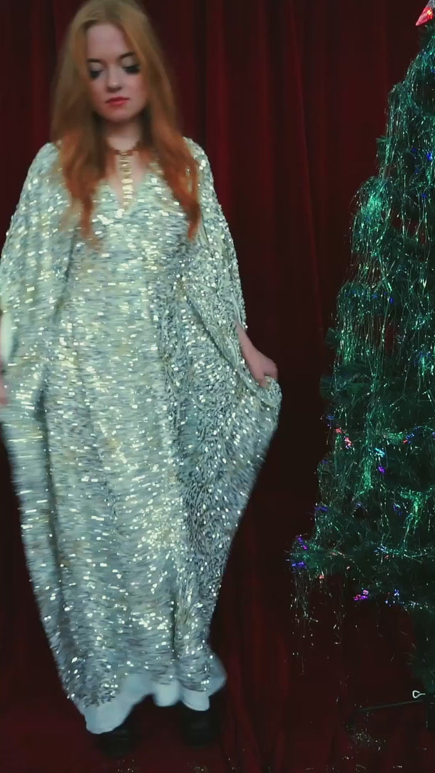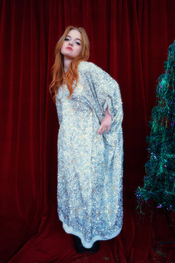 Ice Empress Sequin V-Neck Kaftan Gown. Made from an ornate silver and iridescent sequin fabric. Has a soft drape and luxurious weight.