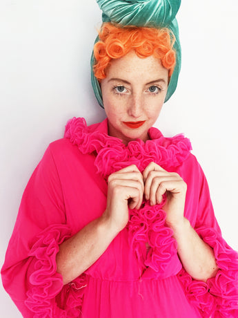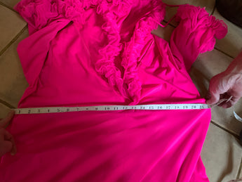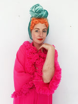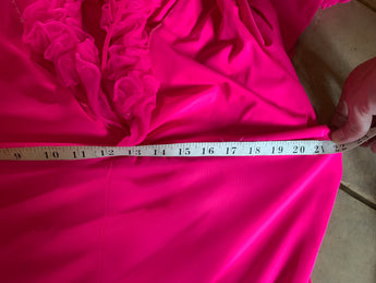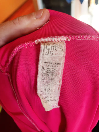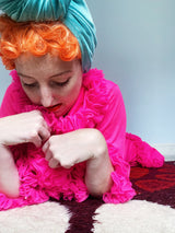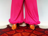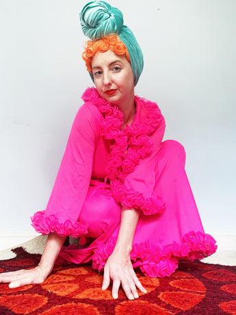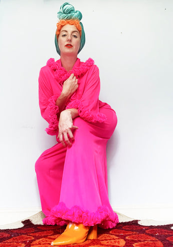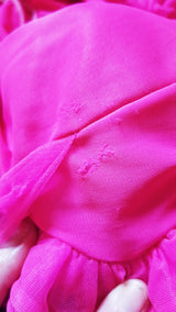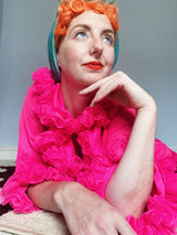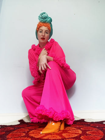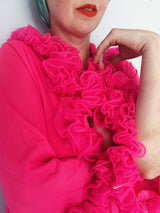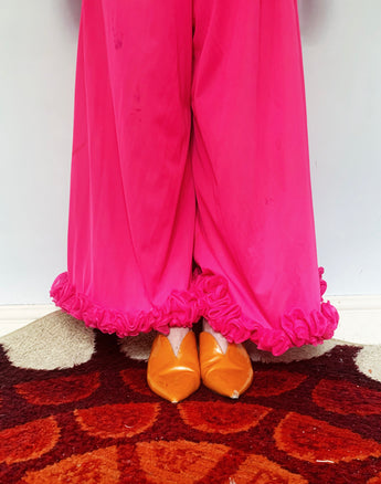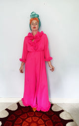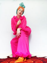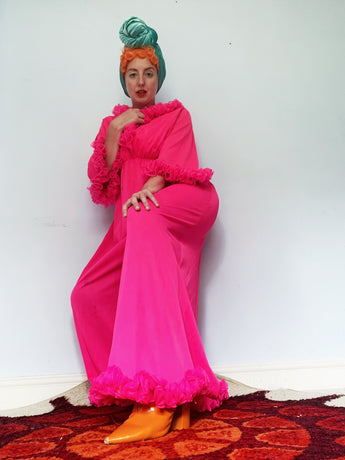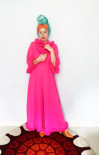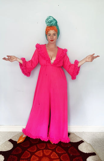 Have we all just died and gone to pink fluffy heaven? An RARE original 1960s nylon ruffle jumpsuit. Truly one of a very few still available out there. Under the bust is elasticated and has a lot of stretch and give to it and lots of fluidity. A roomy and comfy piece as well as statement and flamboyant.