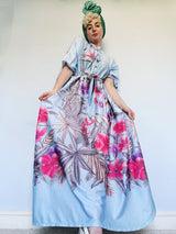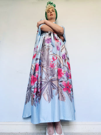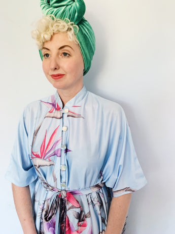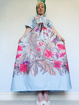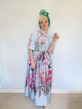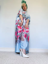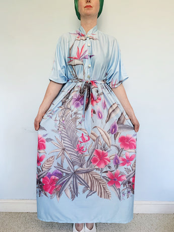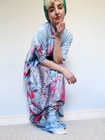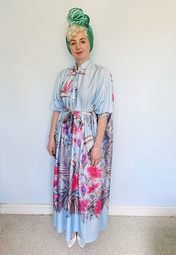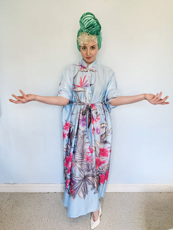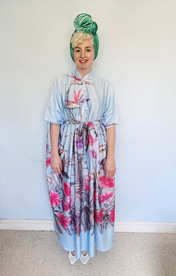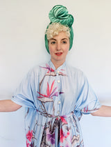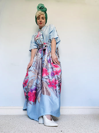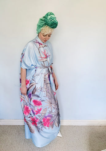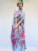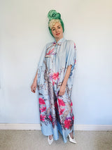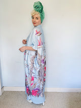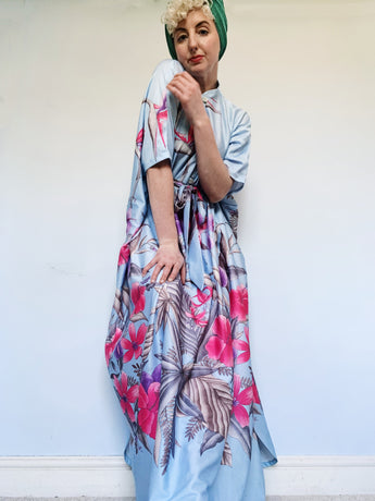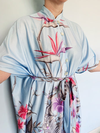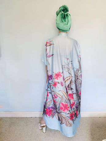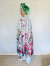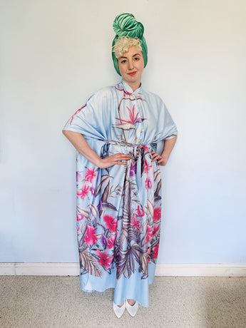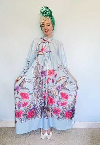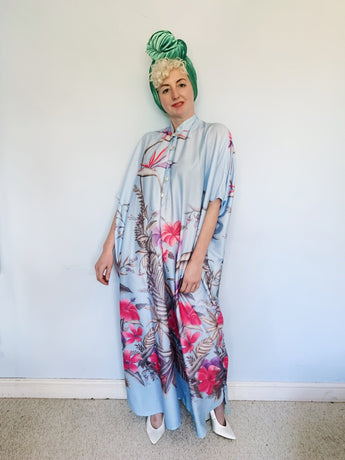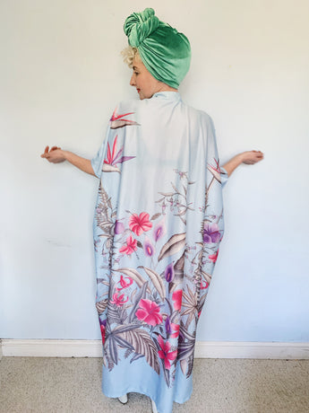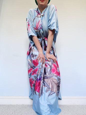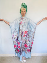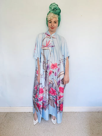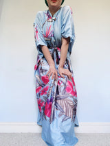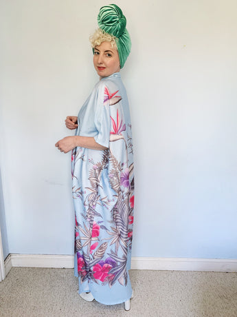 Blue Floral Birds of Paradise Print Kaftan Dress