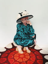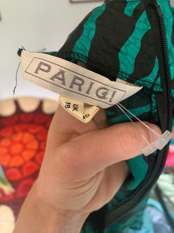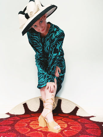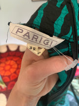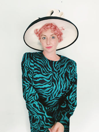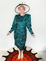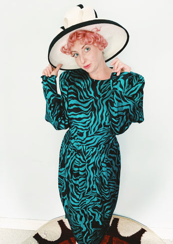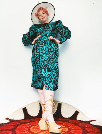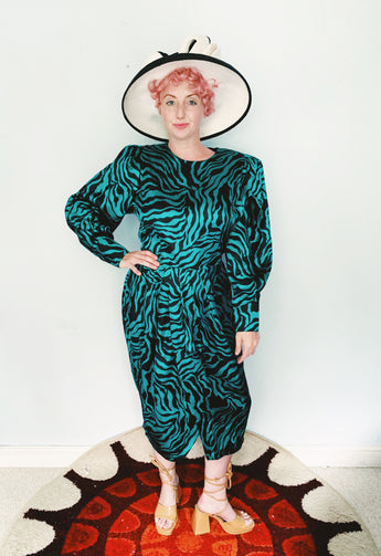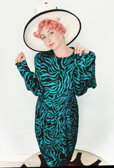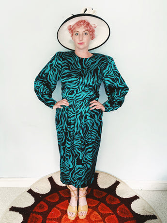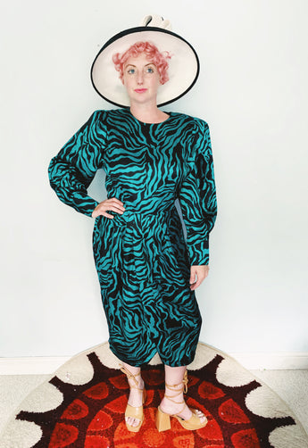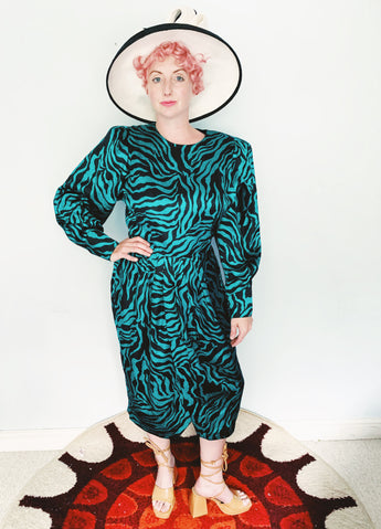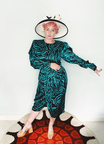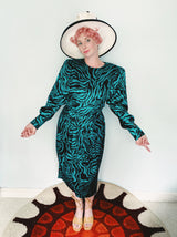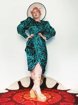 Sexy print 80s silk dress with big shoulder pads. Would look great with a chunky belt in the middle.