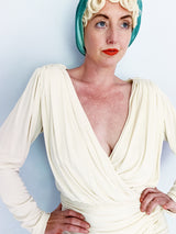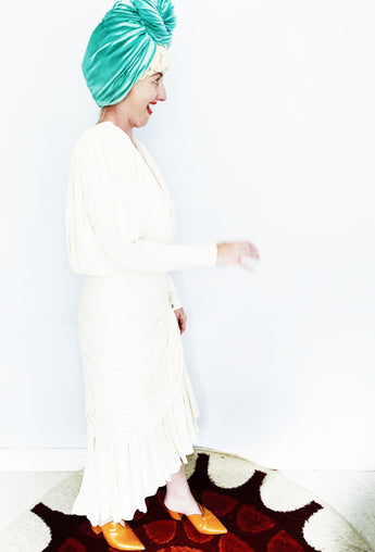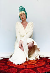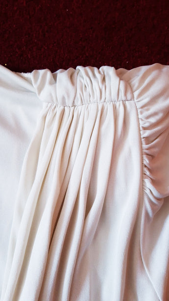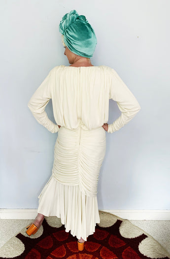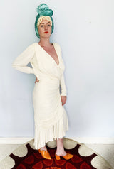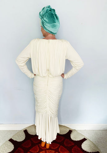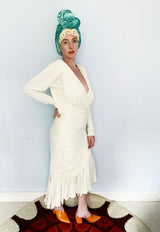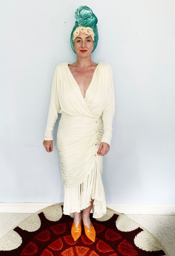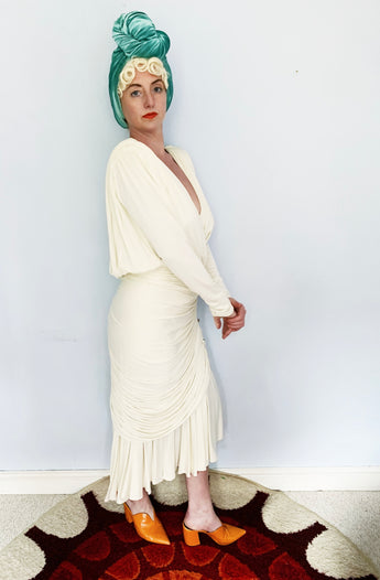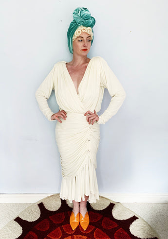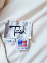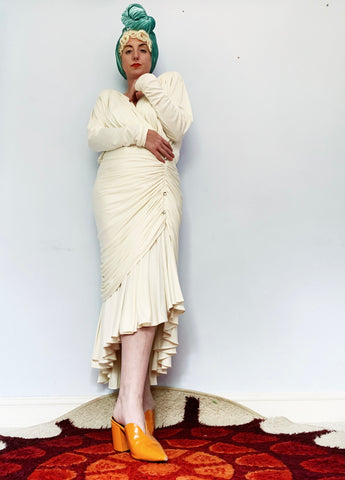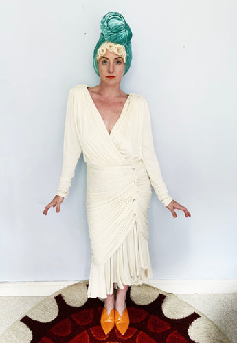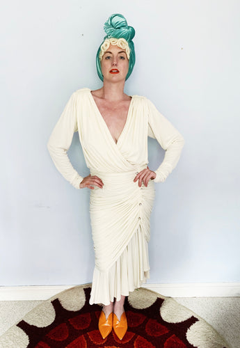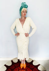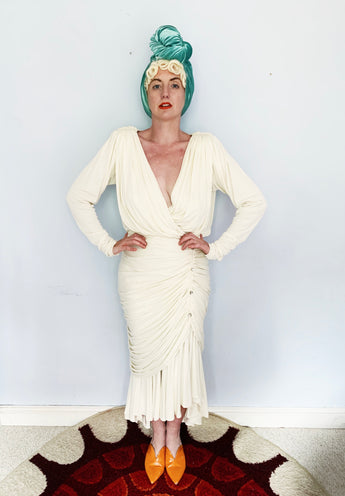 From one of my favourite evening wear designers, Tadashi, this is a real elegant showstopper of a dress. Killer 80s shoulder pads, a ruched and ruffled skirt to compliment a figure hugging hips and bum, a daring low cut plunge neckline, zip up back, swishy bottom skirt, and diamanté buttons to finsh. Shes sexy as hell and makes you feel nothing but utterly divine. Made from a stretch fabric so quite a bit of give.